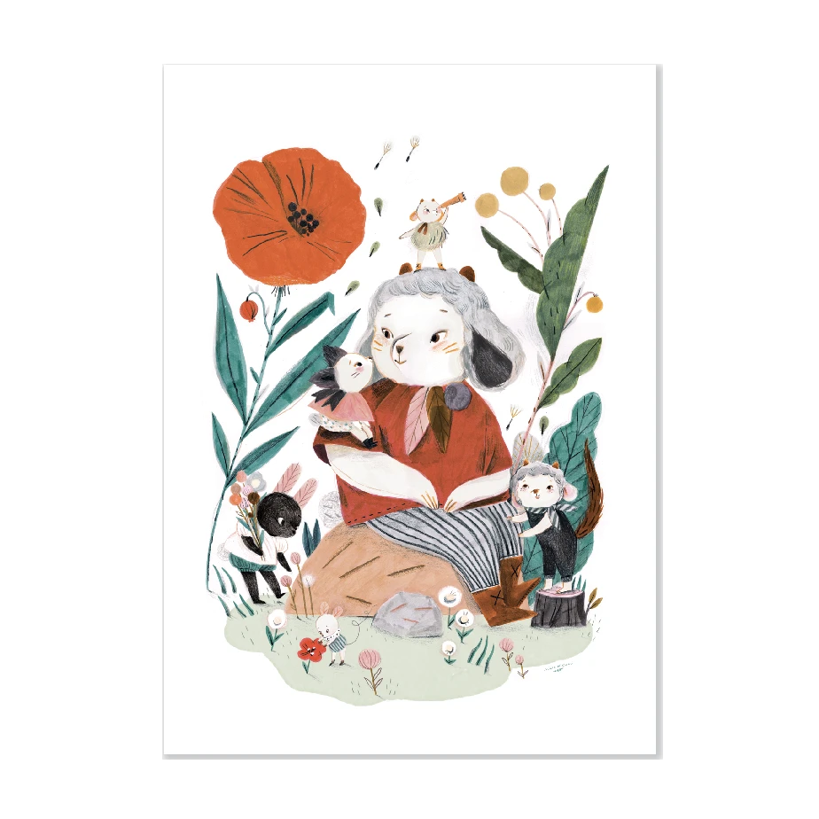 Affiche 50X70cm de la collection AprĂšs la pluie. Fenouil le mouton et ses amis explorent au jardin. IllustrĂ©e par Lucille Michieli. ImprimĂ© en France Ă base d’encres vĂ©gĂ©tales sur du papier certifiĂ© FSC. Vendue sous tube.