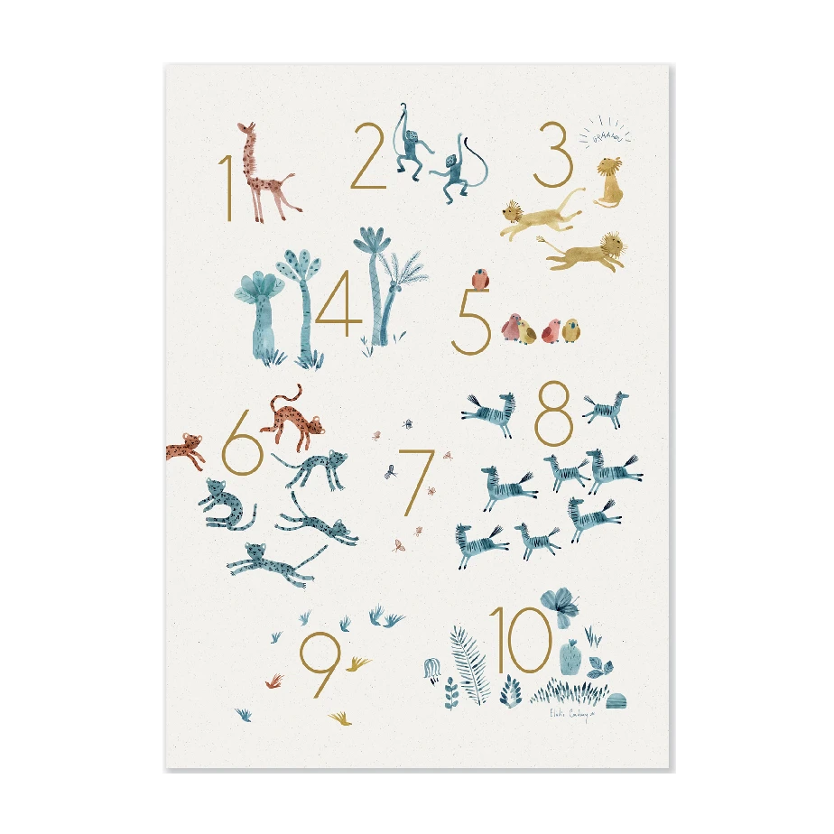 Affiche 50x70cm de la collection Sous mon Baobab. 1,2 3 4 … Combien y-a-t-il de lions ? de zĂšbres ? Pour dĂ©couvrir les chiffres et apprendre Ă compter. IllustrĂ©e par Ălodie Coudray. ImprimĂ© en France Ă base d’encres vĂ©gĂ©tales sur du papier certifiĂ© FSC. Vendue sous tube.