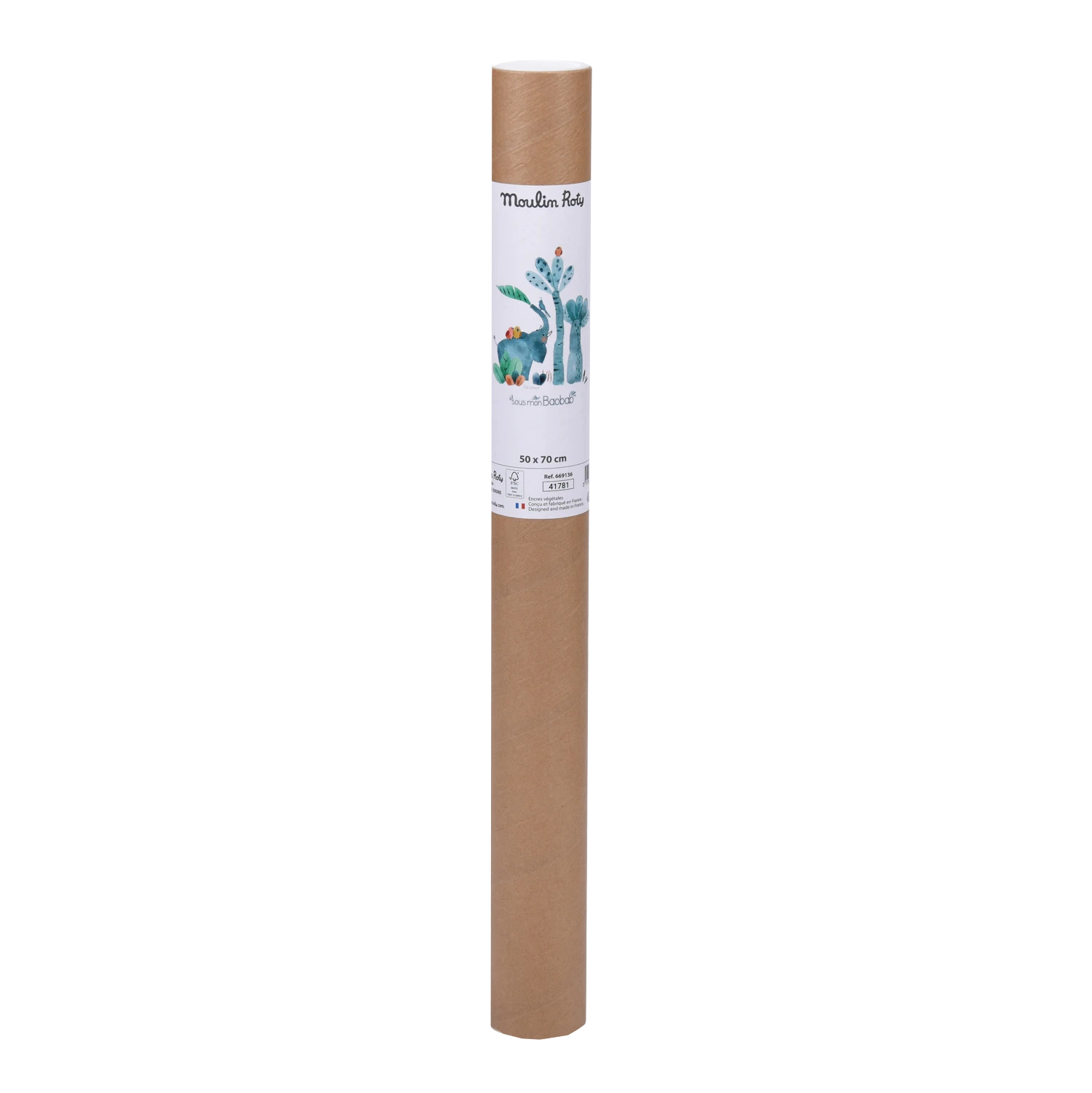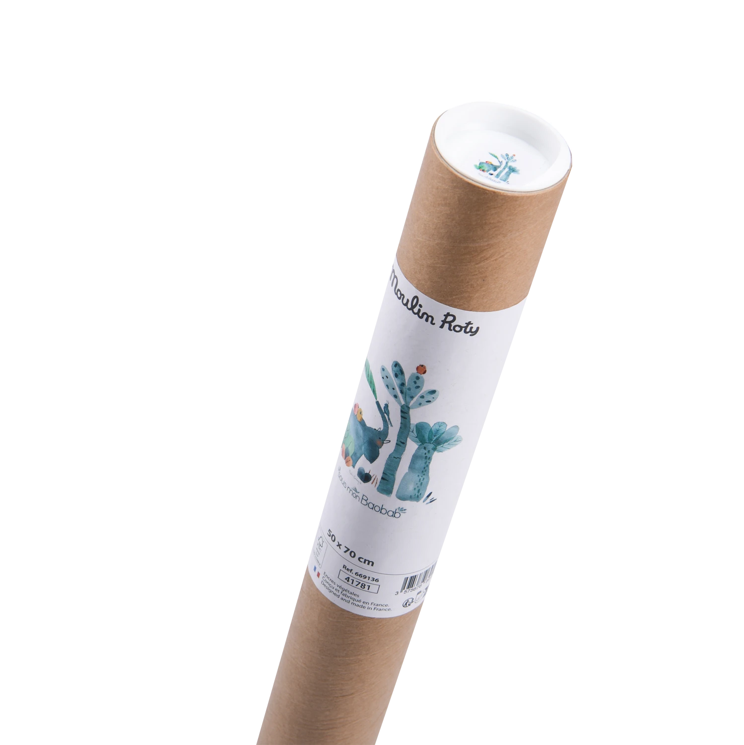 Affiche 50x70cm de la collection Sous mon Baobab. Bergamote l’éléphant s’amuse en bonne compagnie au milieu des herbes folles. Illustrée par Élodie Coudray. Imprimé en France à base d’encres végétales sur du papier certifié FSC. Vendue sous tube.