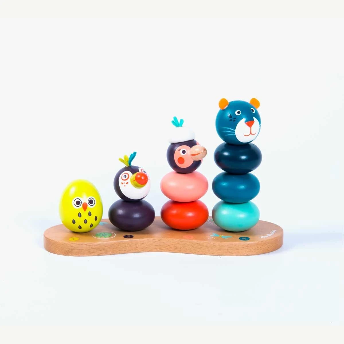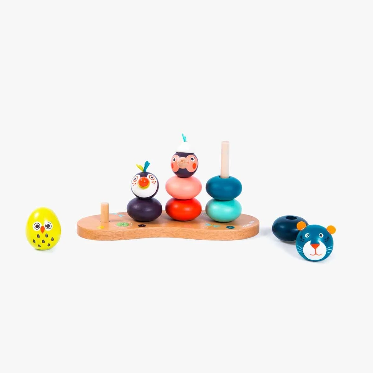 Empilable multi-activités pour développer la capacité de l’enfant à manipuler et compter. Sur un socle en bois, empilez les parties en bois coloré pour recomposer les animaux de la jungle : la panthère, l’oiseau, le toucan et l’œuf… ou mélangez-les !