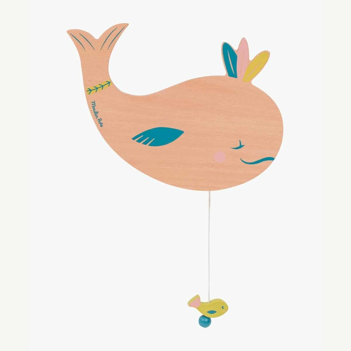 Boîte à musique murale tendre et originale en bois naturel représentant une baleine endormie. Sous son ventre se trouve un cordon à tirer pour actionner une douce mélodie qui émerveillera bébé. Au bout de cette ficelle, un petit poisson jaune et une perle bleue apportent une touche colorée à ce boîtier musical. Avec son design sobre et élégant, cette boîte à musique est un très bel élément de décoration. A fixer sur un mur, elle habillera avec charme la chambre de votre enfant en créant une atmosphère apaisante. Nous retrouvons sur la tête de la baleine trois petites plumes en bois peint bleu, rose et ocre, notes de fantaisie emblématiques de la gamme Le Voyage d’Olga, si délicate et raffinée. Idée cadeau de naissance originale.