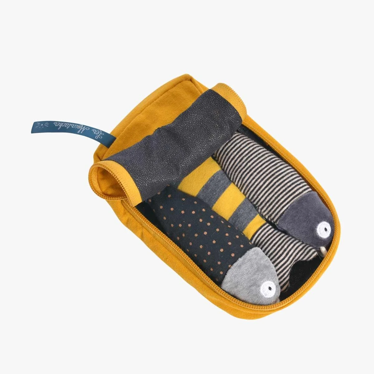 Une belle boite à sardine avec un pouet-pouet dans un poisson, un hochet dans un autre et un plastique qui fait du bruit dans le dernier.