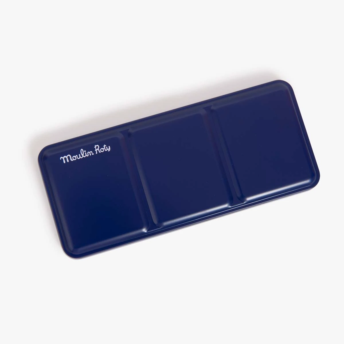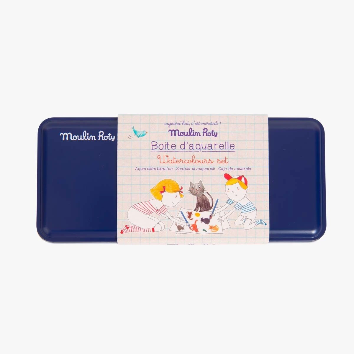 Boîte en métal avec 24 godets aquarelles aux couleurs intenses, un pinceau avec réservoir d’eau et une éponge. La boîte servira également de palette pour créer des mélanges de couleurs. Idéal pour débuter la peinture !