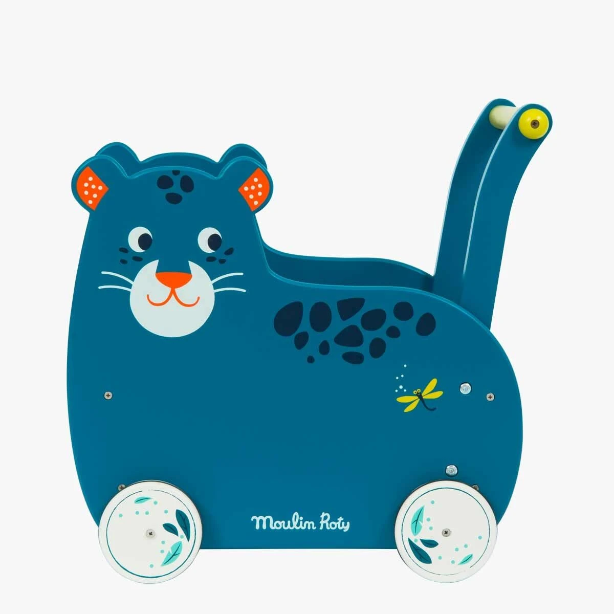 Pour accompagner l’enfant dans l’apprentissage de la marche et transporter tous ses jouets : chariot en bois peint, aux formes rondes, avec l’adorable minois de Zimba la panthère !