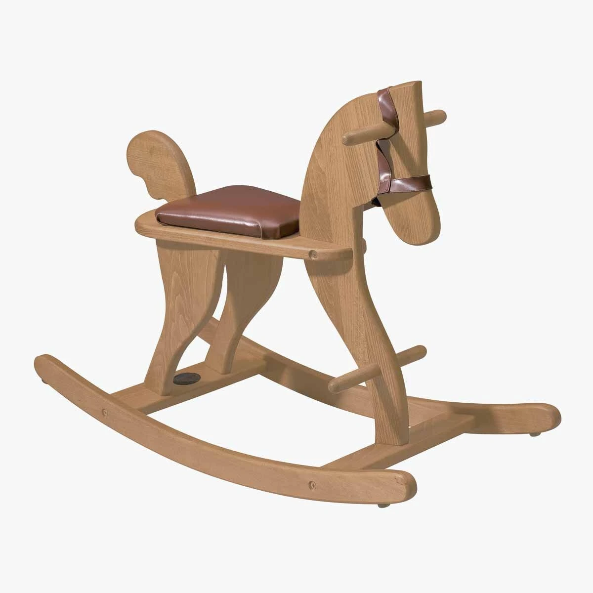 Cheval à bascule, intemporel et authentique, en hêtre massif verni et assise en simili cuir.Hauteur de l’assise 38cm