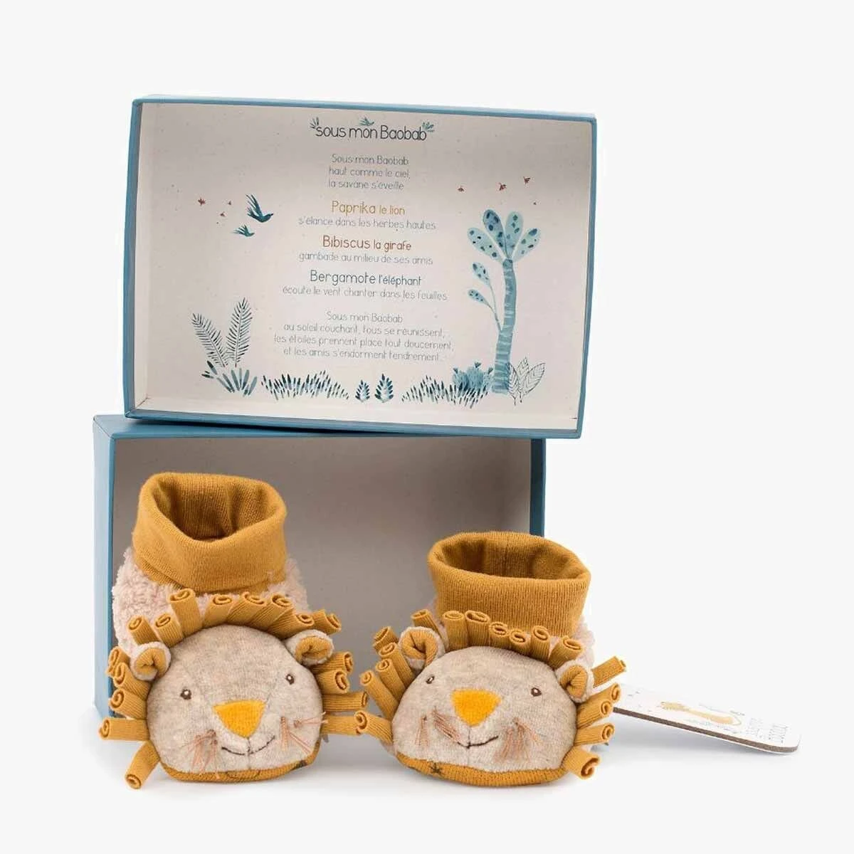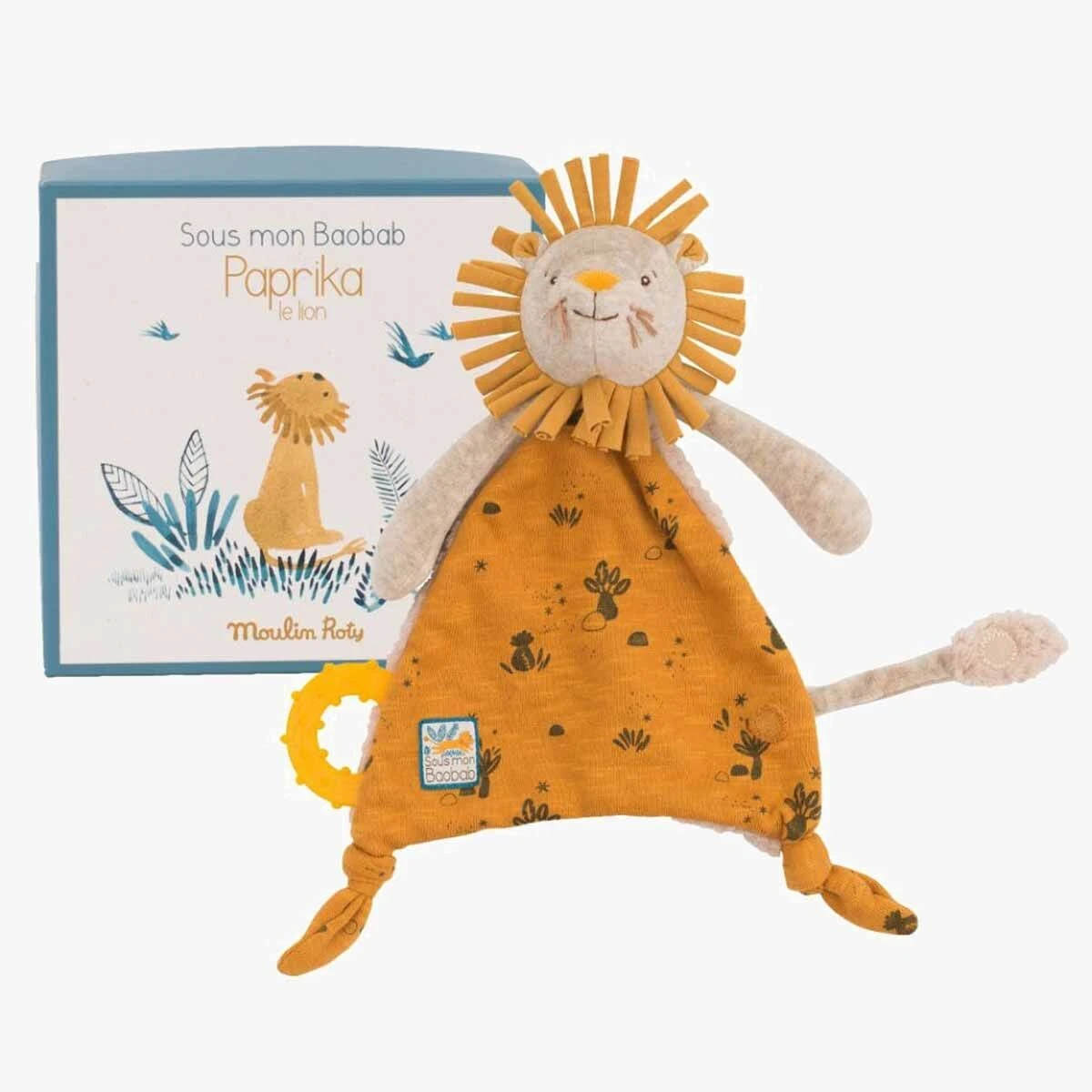A la recherche d’un coffret prêt à offrir pour un nouveau-né ? Cette box Moulin Roty est le cadeau naissance personnalisé idéal pour combler les jeunes parents. Ce coffret cadeau contient 3 essentiels pour gâter bébé : un doudou attache-tétine à personnaliser Paprika le lion avec les chaussons lion et le hochet en bois assortis. Le tout est livré dans une magnifique boîte illustrée aux couleurs de la collection Sous mon baobab et qui peut être conservée pour ranger les premiers souvenirs de bébé. Petit plus : la broderie sur le doudou est offerte ; réalisée par nos soins, le succès est garanti auprès des parents ! Enfin, vous pouvez accompagner cette box naissance d’un petit mot et la faire livrer directement aux nouveaux parents pour leur faire une belle surprise.