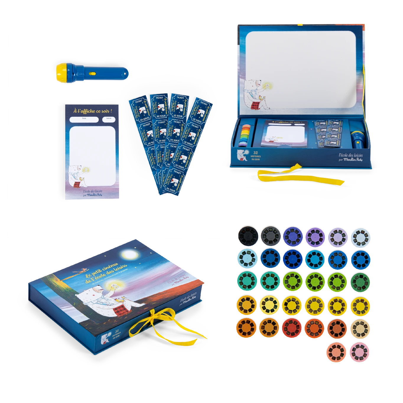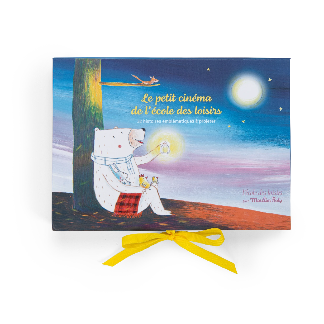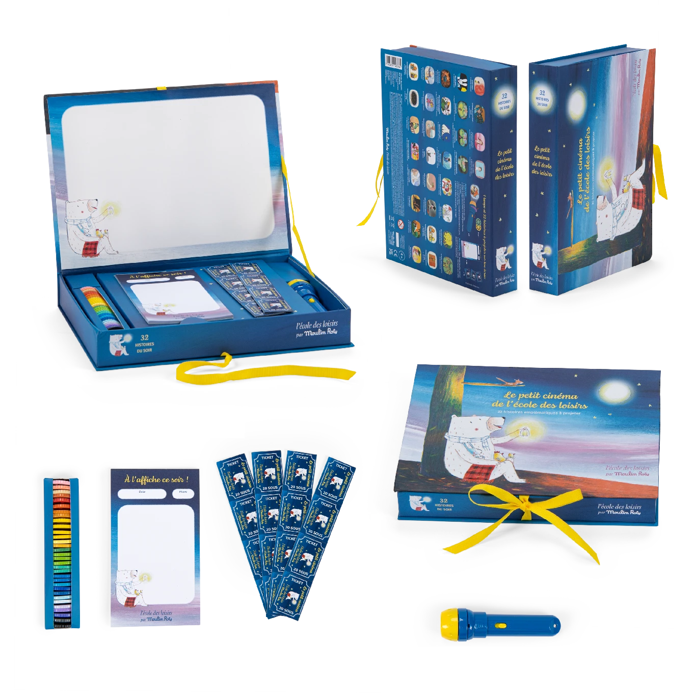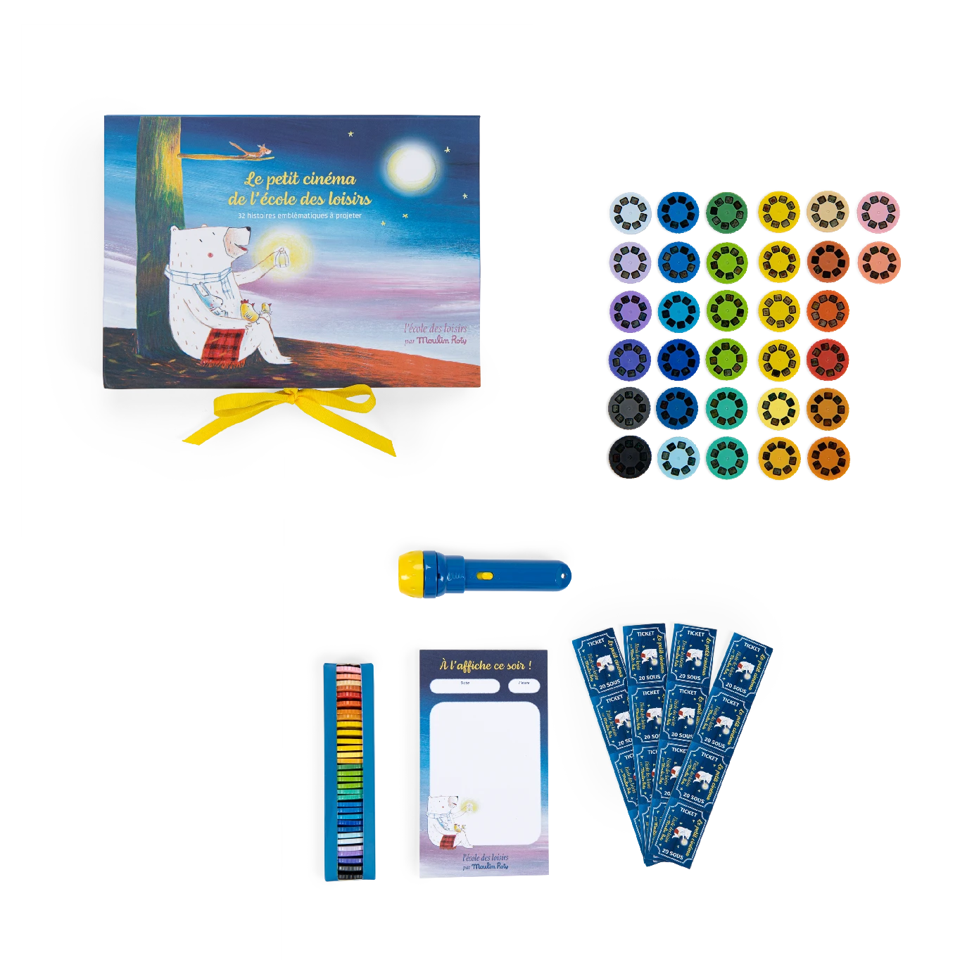 Le cinéma à la maison ! 32 histoires emblématiques de l’école des Loisirs à projeter réunies dans un coffret luxe, comprenant une lampe, 32 disques diapositives, un bloc de programmes et des tickets de cinéma pour partager la séance avec les copains….