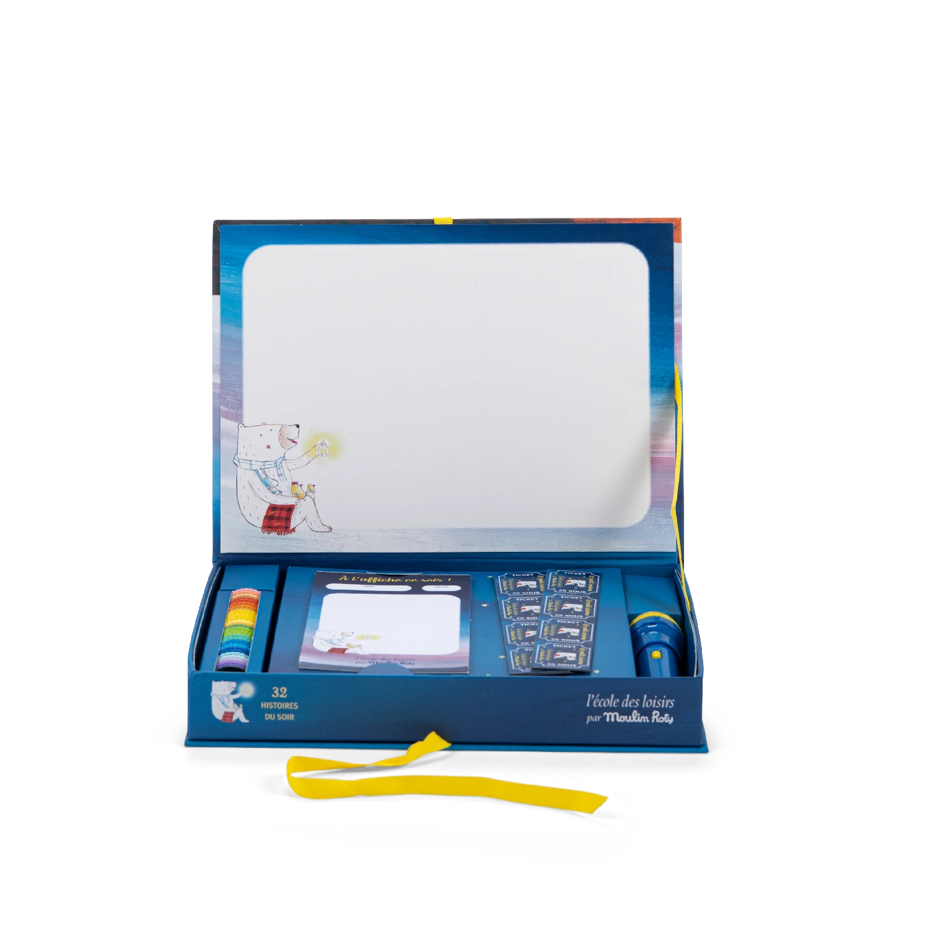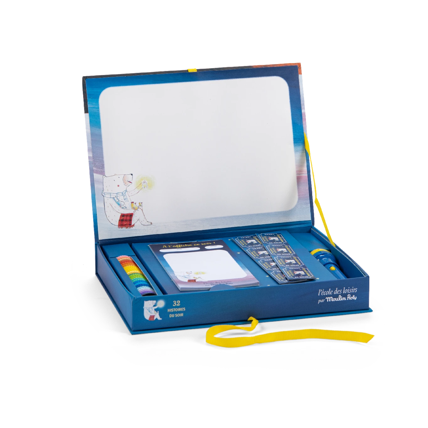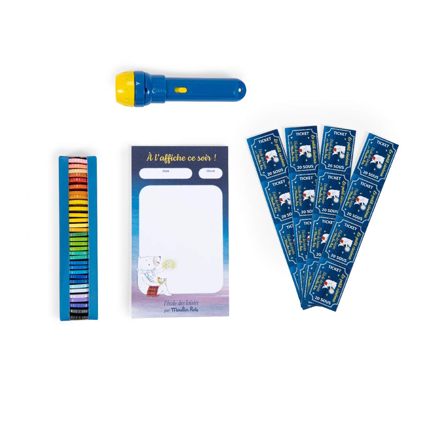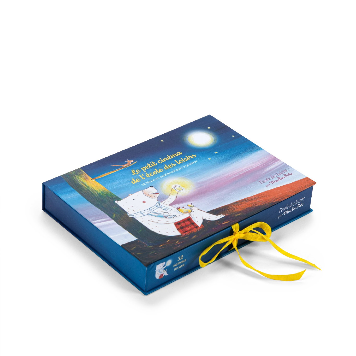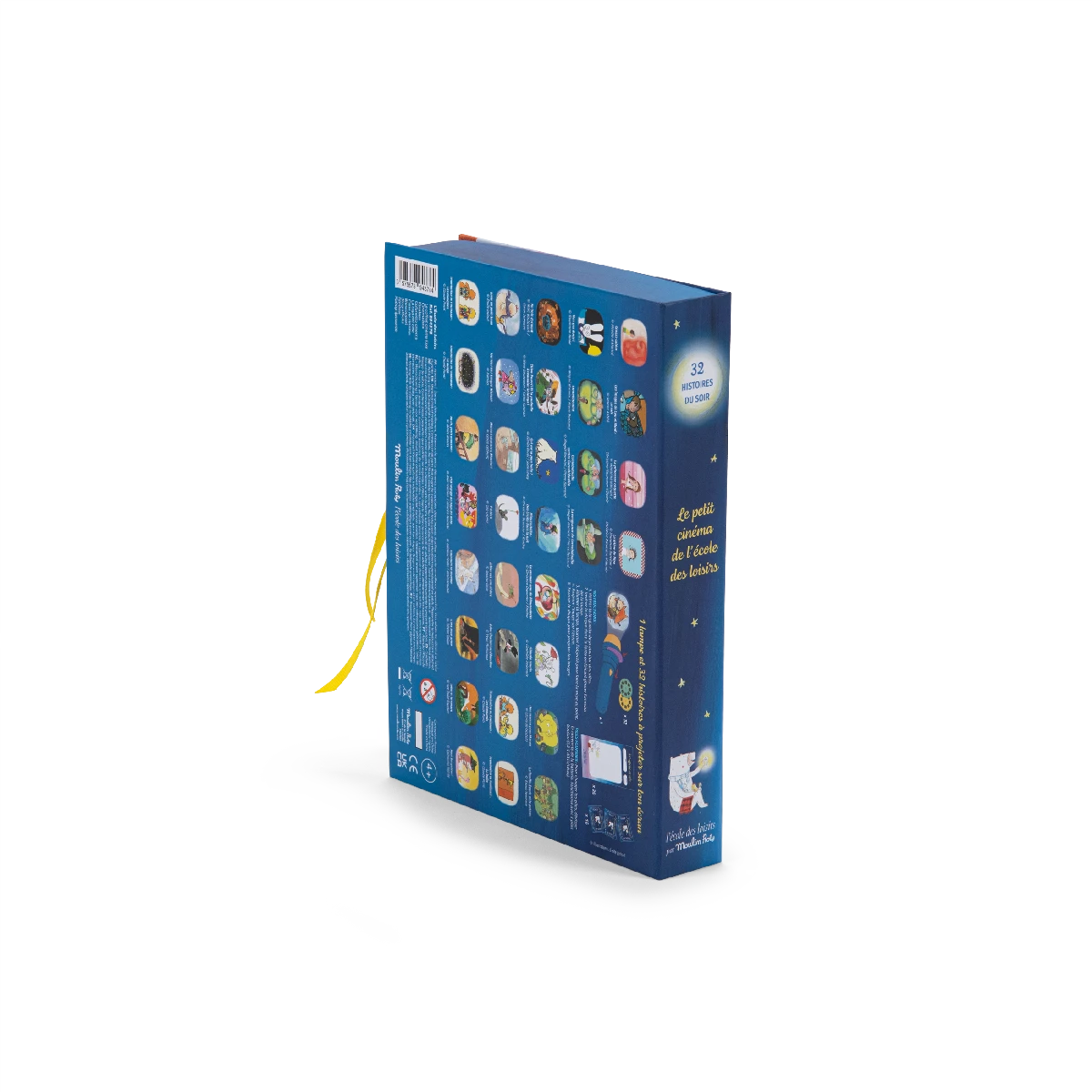 Le cinéma à la maison ! 32 histoires emblématiques de l’école des Loisirs à projeter réunies dans un coffret luxe, comprenant une lampe, 32 disques diapositives, un bloc de programmes et des tickets de cinéma pour partager la séance avec les copains….