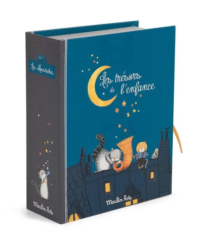 Coffret à trésors pour ranger dans chacun des tiroirs toutes les douceurs de l’enfance. Reprend tous les personnages de la gamme dans leur univers de la nuit. Fermeture avec liens et petite cartonnette en forme d’enveloppe pour y écrire son nom.