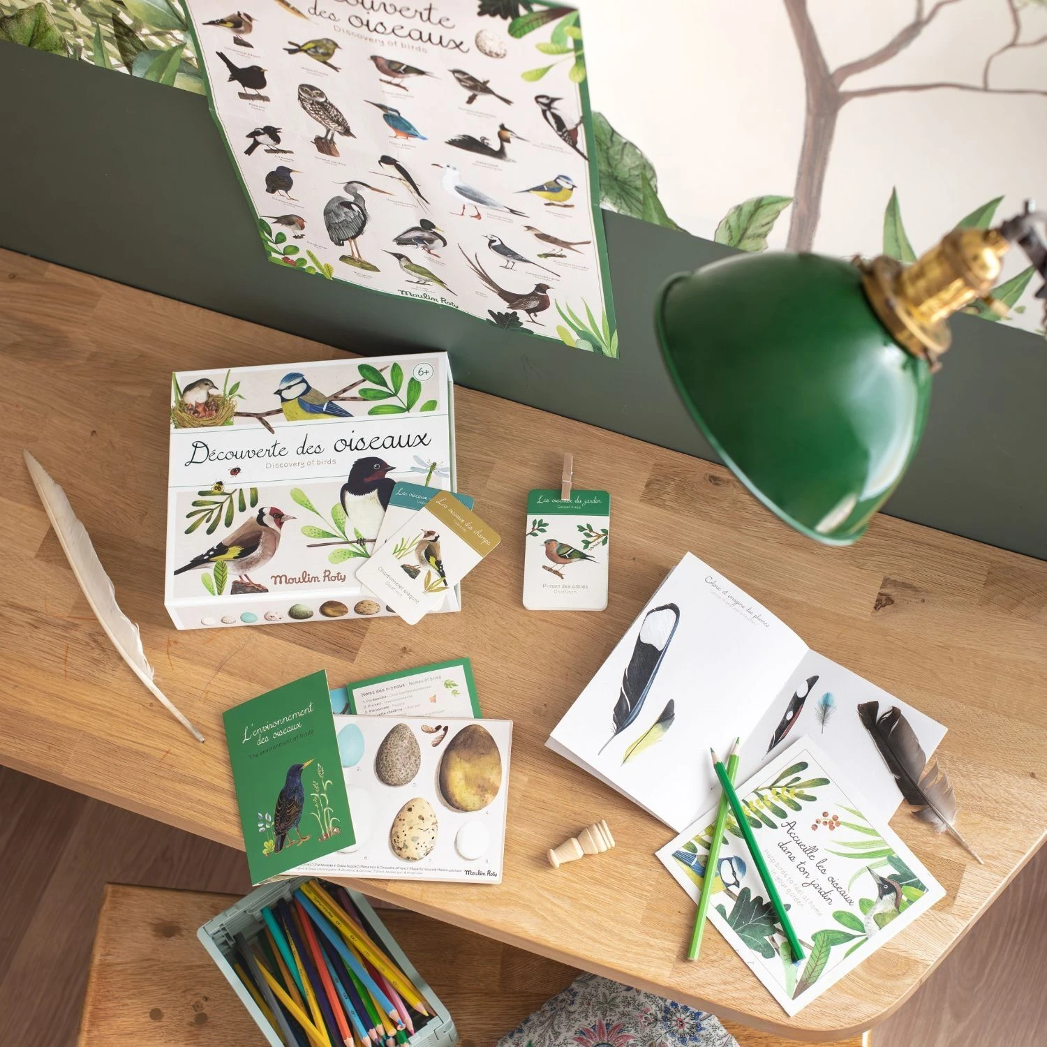 Découvre les oiseaux qui t’entourent ! Dans ce coffret pédagogique, retrouve tout le nécessaire pour reconnaitre les oiseaux, les accueillir dans ton jardin et les imiter. Comprend 26 accessoires : cartes d’identification, cahier d’activités