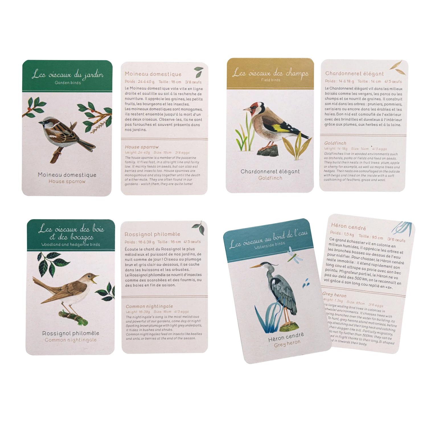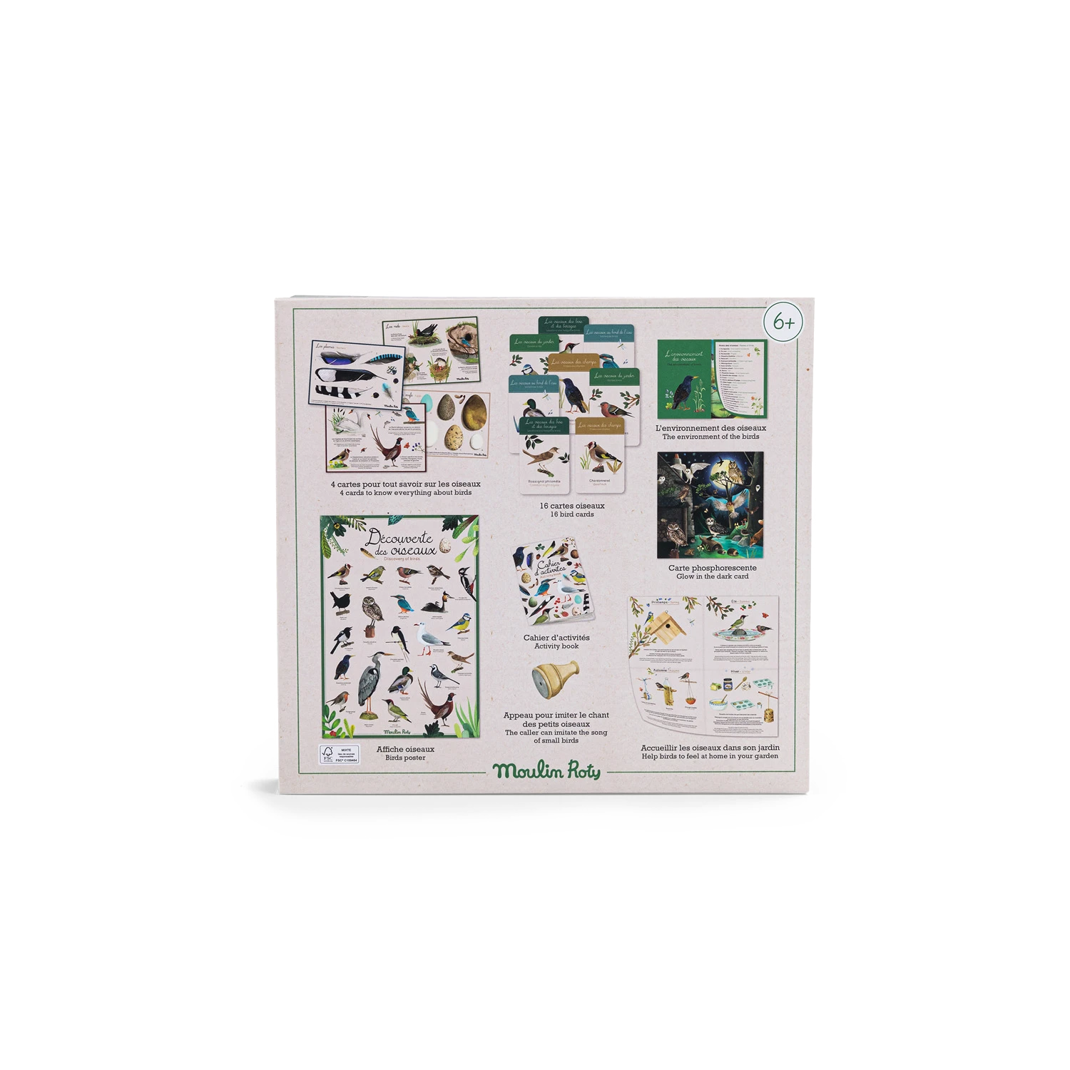 | Contenu du produit | 4 cartes (plumes, œufs, nids, alimentation), 16 portraits d'oiseaux, 1 appeau pour imiter les oiseaux, 1 carte nocturne phosphorescente, 1 cahier d'activités, 1 affiche, 1 notice, 1 dépliant sur l'environnement des oiseaux |