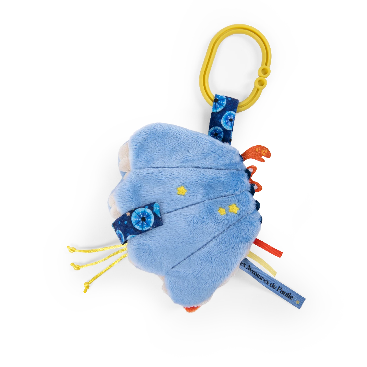 Ce coquillage a quitté son rocher avec plein d’activités colorées pour jouer avec bébé : miroir, étiquettes et rubans à attraper, pouët, papier crissant… Il s’accroche partout et se referme par un scratch dont le bruit plait beaucoup aux tout-petits.