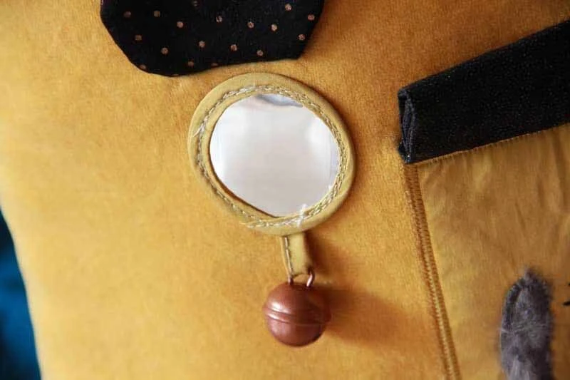Grelot cuivre, miroir avec biais jaune, plastique qui fait du bruit dans les nœuds : tout un tas d’activités pour amuser bébé dans un coussin en forme de maison.