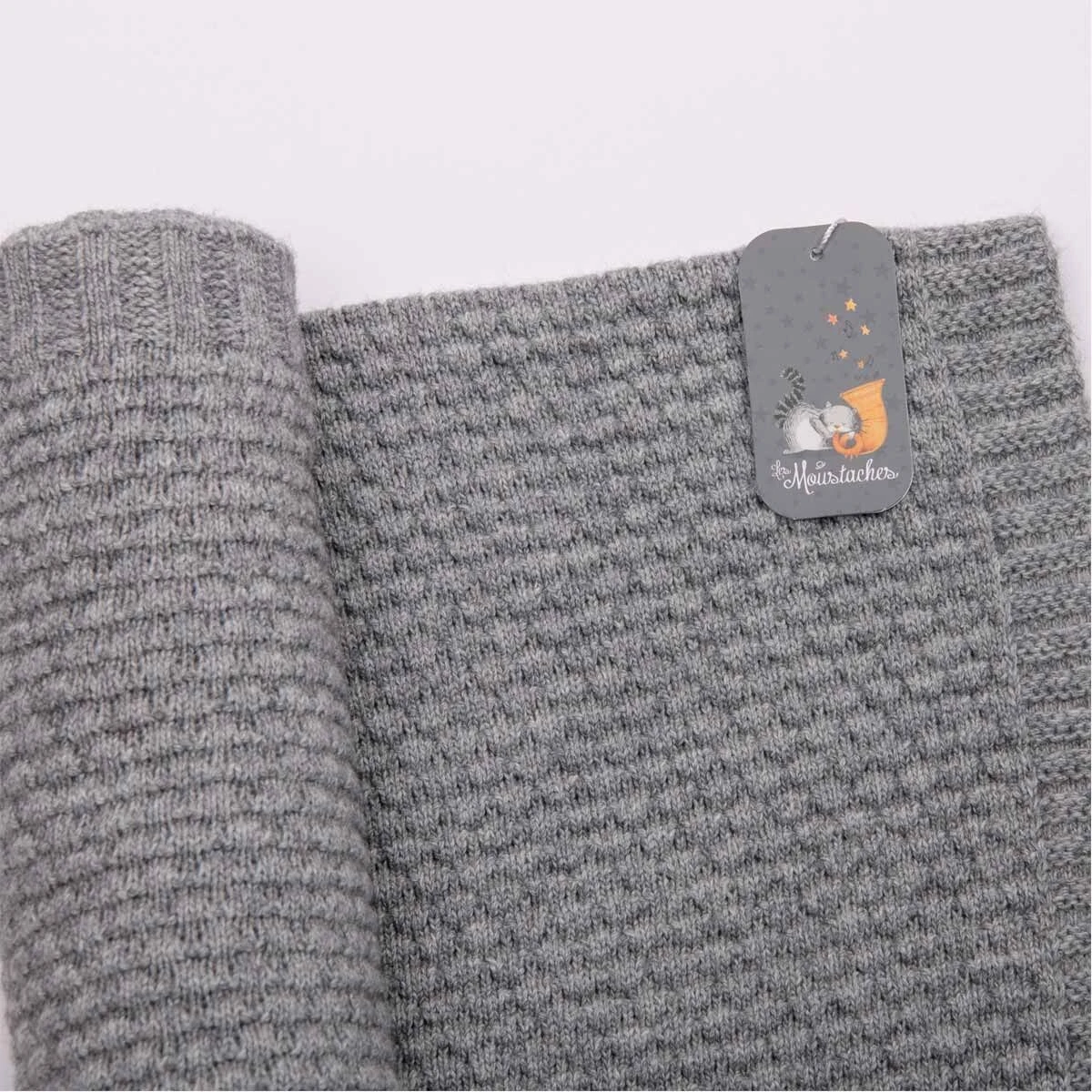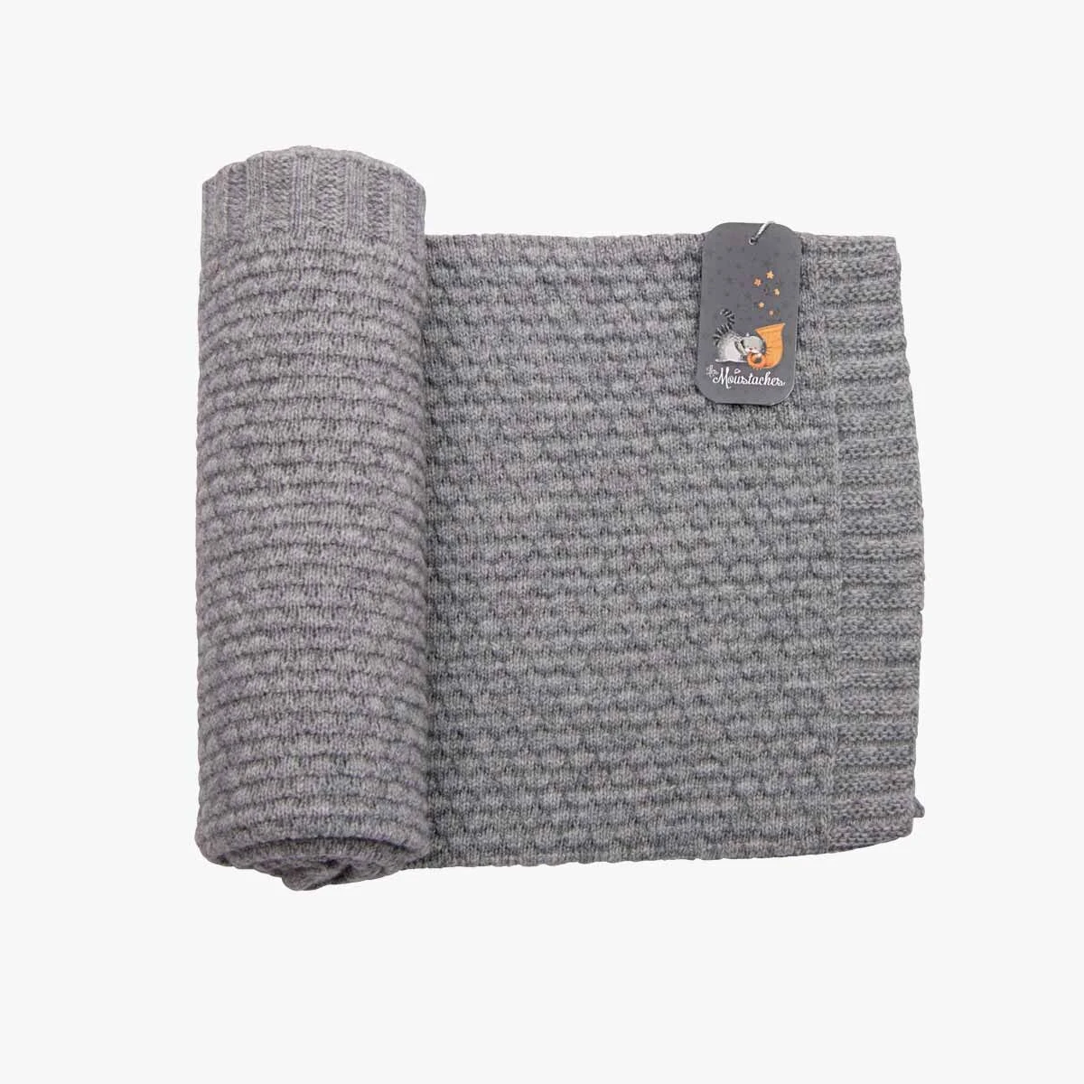 Couverture en tricot grise certifiée OEKO-TEXŸ qui aide les petits à réguler leur température corporelle grùce aux matiÚres utilisées : 25% coton, 25% viscose, 25% polyamide, 22% laine mérinos et 3% cachemire.