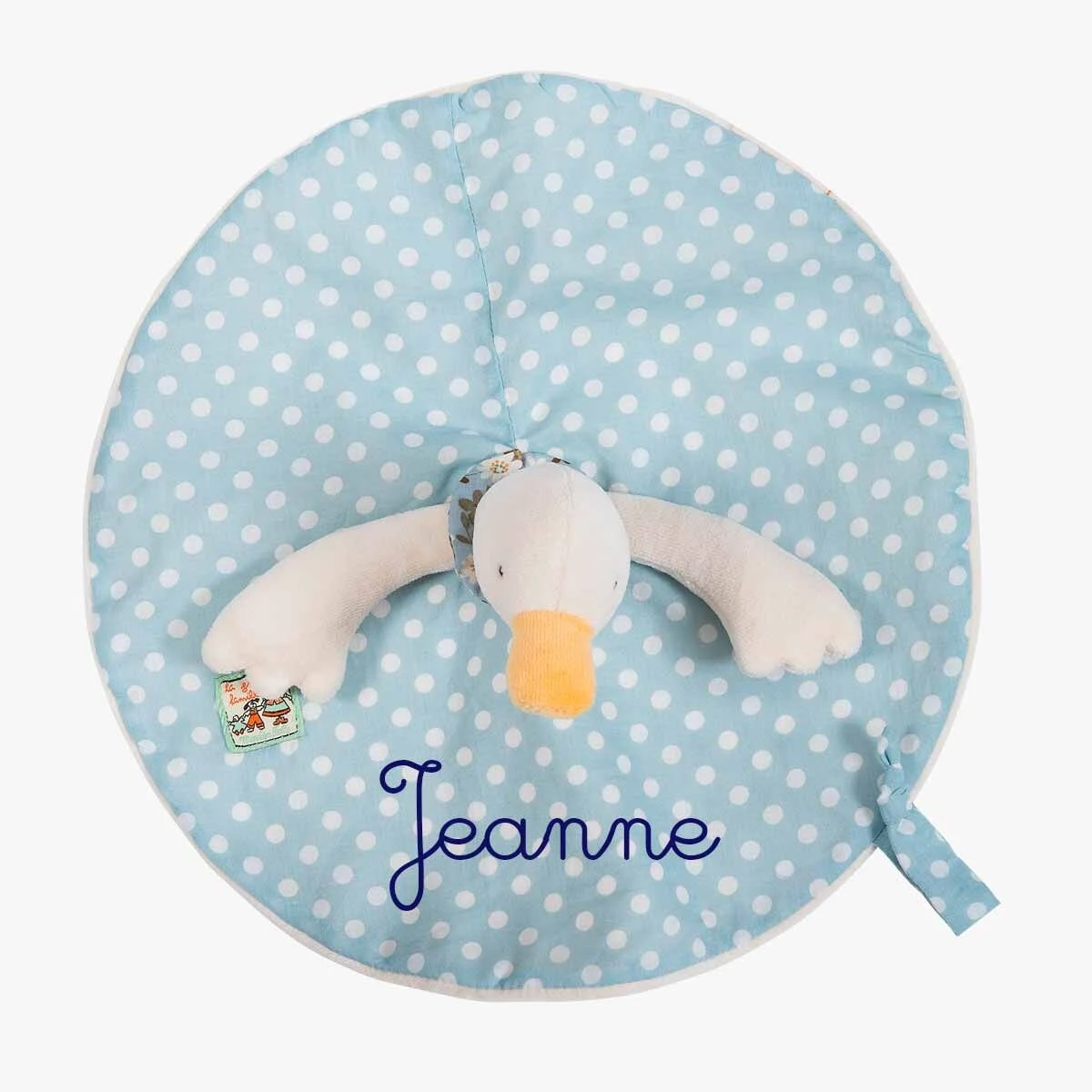 Petite Jeanne la canne, dans sa robe en coton imprimĂ© pois, doublĂ©e velours pour ce doudou plat, facile Ă saisir par les petites mains de bĂ©bĂ©. Il comprend un lien attache tĂ©tine. Peut ĂȘtre brodĂ© au prĂ©nom de l’enfant. IdĂ©al pour un cadeau de naissance.