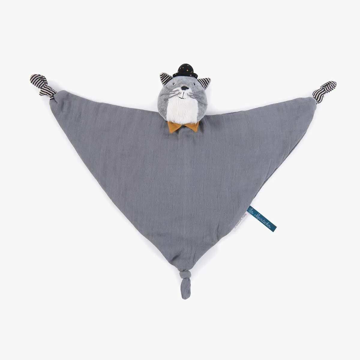 Doudou Fernand le chat en tissu lange gris clair, coiffé de son incontournable chapeau ! Noué à chaque coin, ce doudou plat est facile à saisir par les petites mains de bébé. Il peut être brodé au prénom de l’enfant. Idéal pour un cadeau naissance.