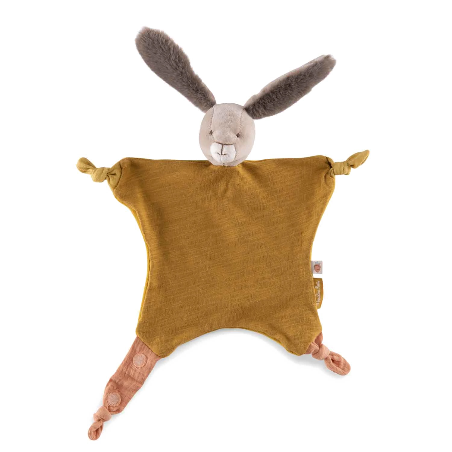 Doudou plat lapin ocre avec attache-tétine. Compagnon bi-matières réconfortant aux grandes oreilles toutes douces. Noué à chaque coin, il est facile à saisir par les petites mains et sera un allié précieux pour bébé.