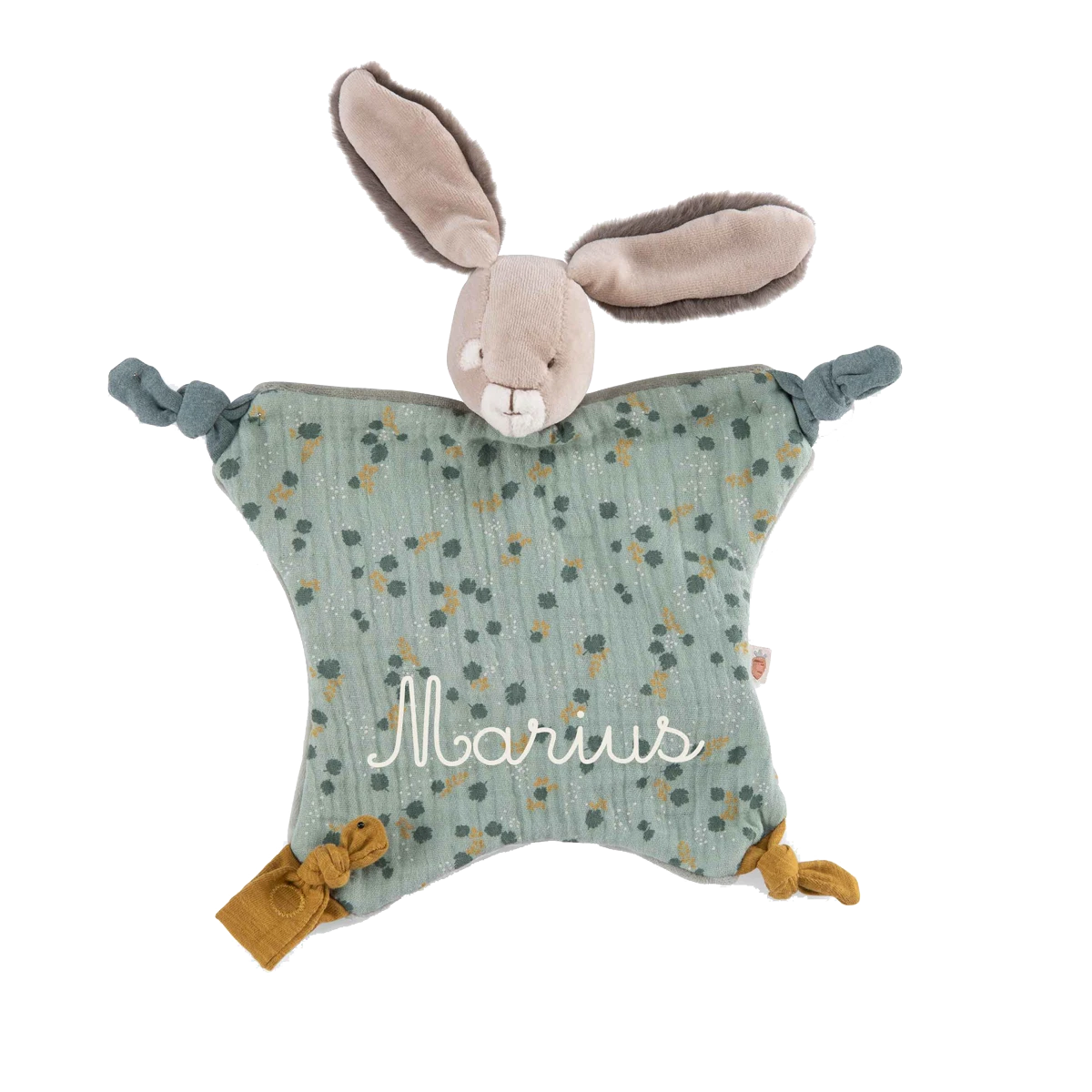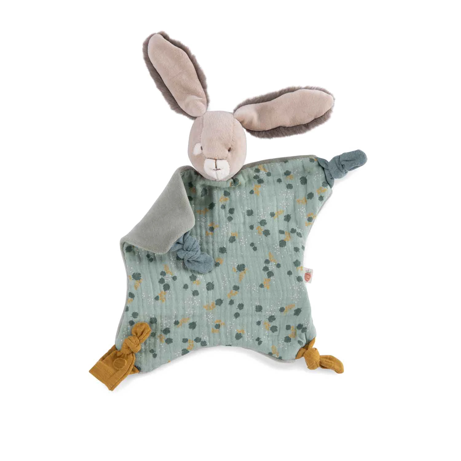 Doudou plat lapin sauge avec attache-tétine. Compagnon bi-matières réconfortant aux grandes oreilles toutes douces, orné de délicats motifs d’un côté. Noué à chaque coin, il est facile à saisir par les petites mains.