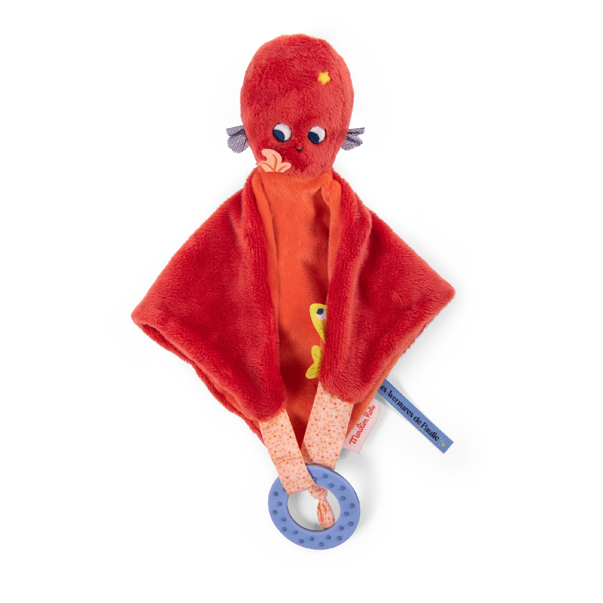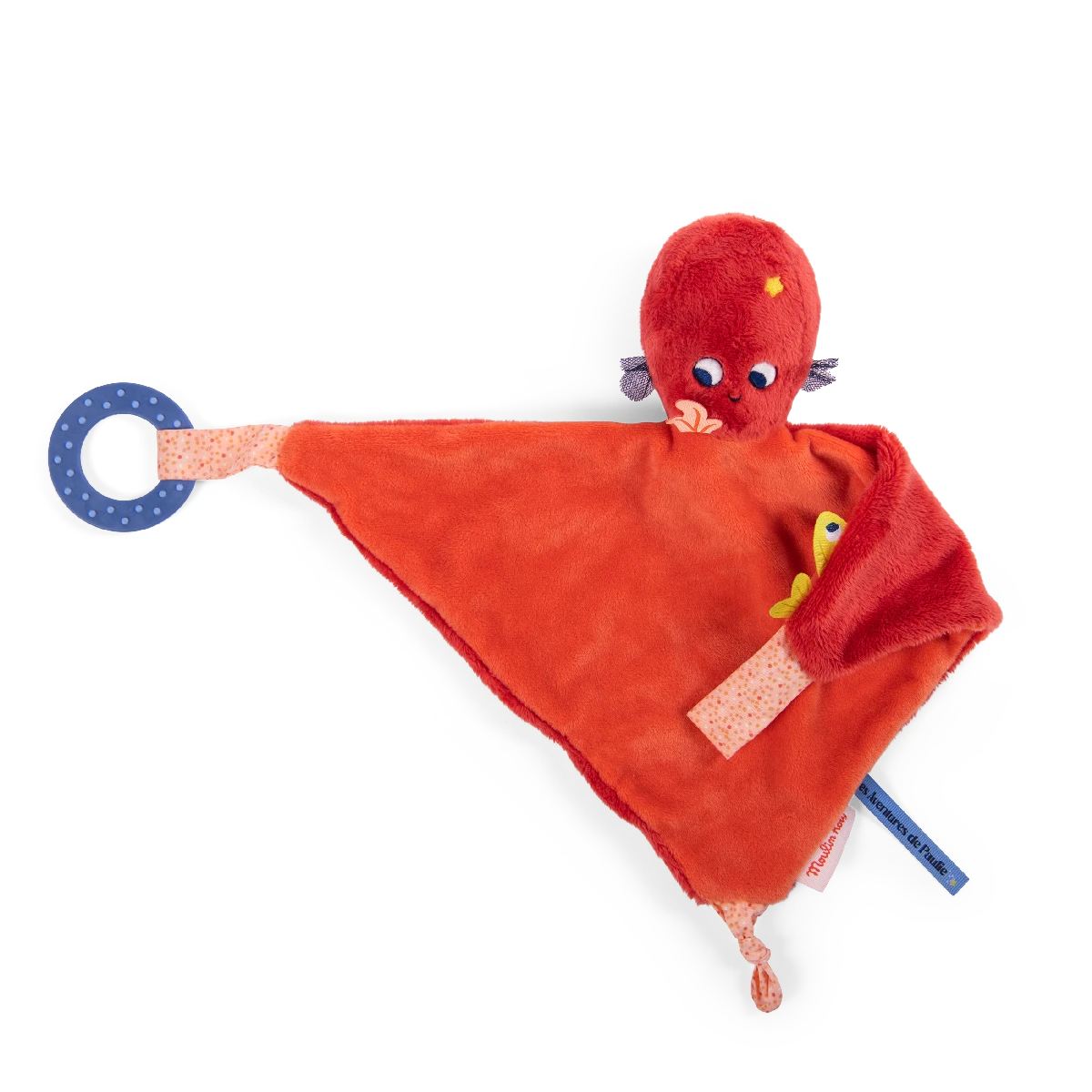 Doudou Paulie le petit poulpe, 3 en 1 avec attache-tétine et anneau de dentition pour soulager la poussée dentaire. Un compagnon bi-matières réconfortant décoré de petites étiquettes très appréciées des bébés et de détails brodés.