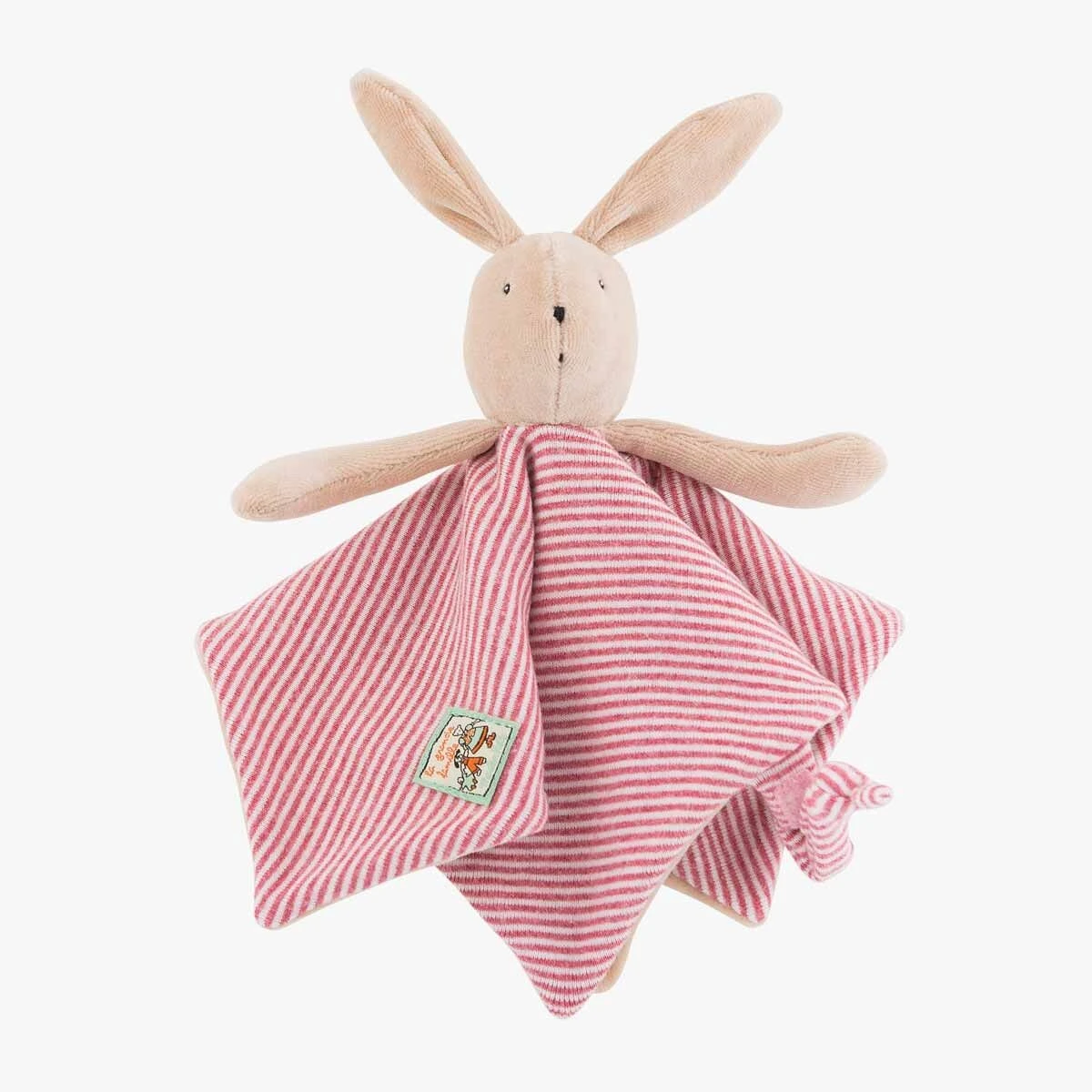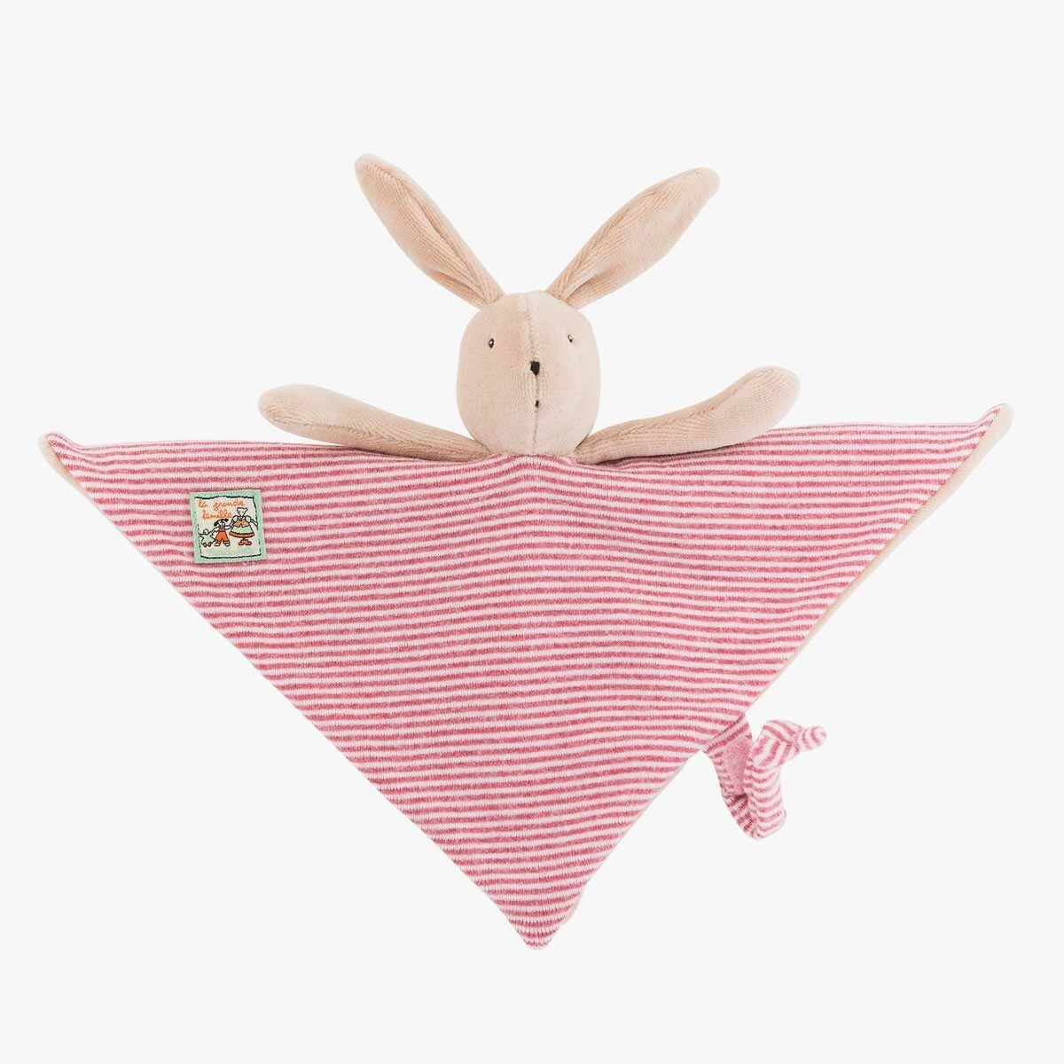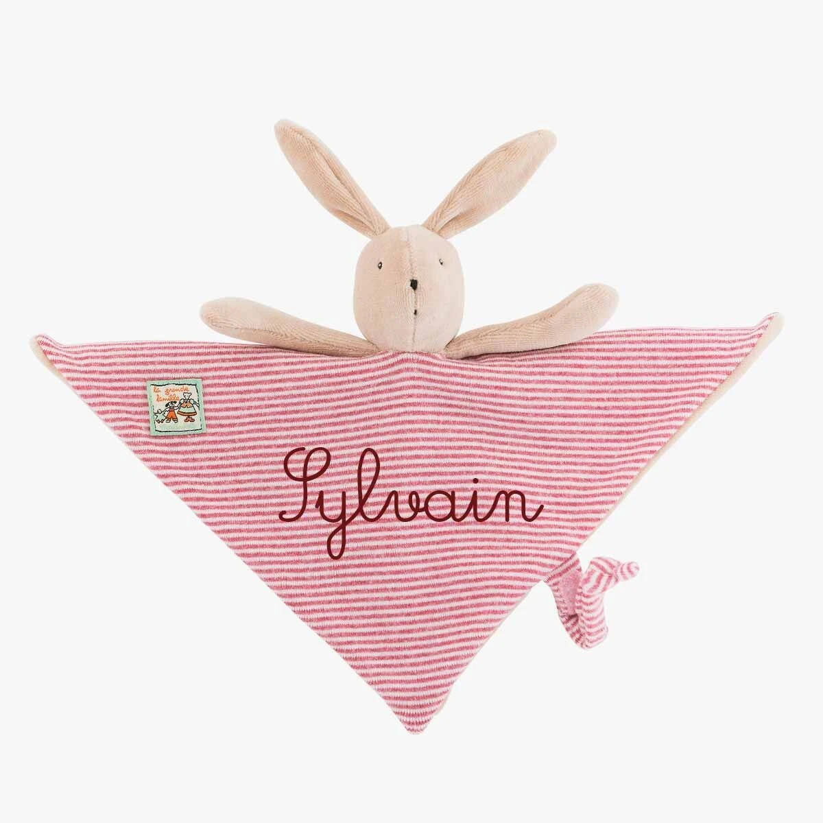 Petit lapin Sylvain, dans sa combinaison en jersey rayé pilou doublée velours pour ce doudou plat, facile à saisir par les petites mains de bébé. Il comprend un lien attache tétine. Peut être brodé au prénom de l’enfant. Idéal pour un cadeau de naissance.