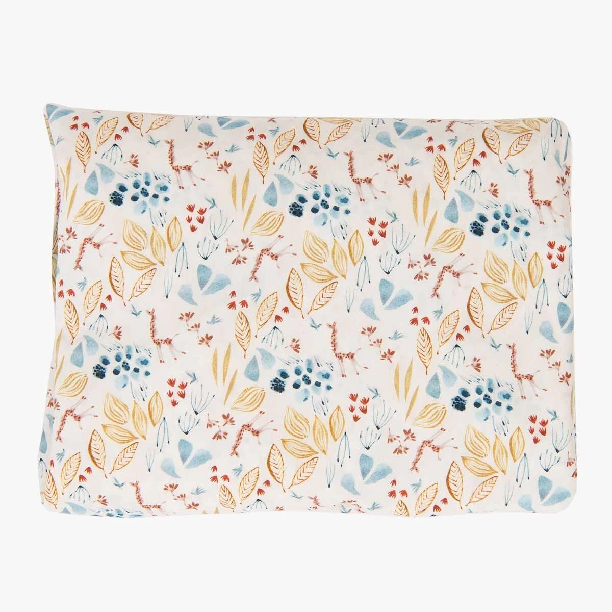 Pour assortir le lit de bébé, drap housse beige 100% coton, avec délicat imprimé au style aquarelle ocre, bleu et argile. On y trouve des girafes, des oiseaux, des feuilles, des fleurs… Dimensions : 70x140cm.