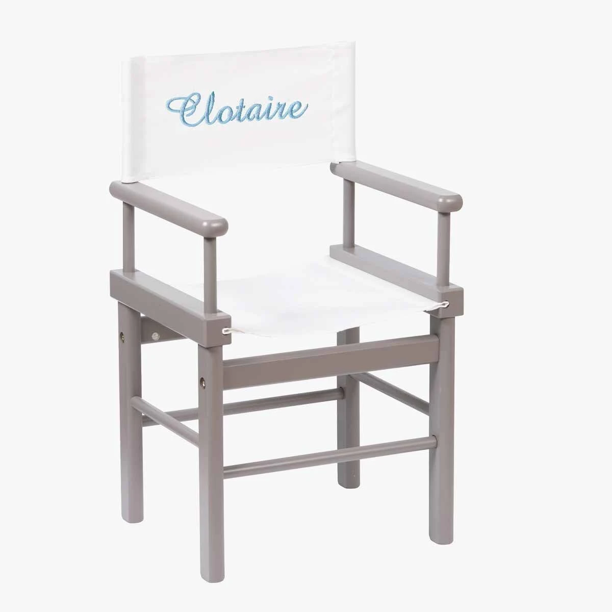 Fauteuil de metteur en scène en bois massif peint en gris foncé, avec dossier en tissu coton à broder au prénom de l’enfant. Supporte jusqu’à 35kg.