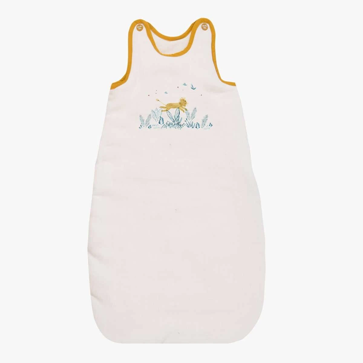 Gigoteuse 6-24 mois, en matières naturelles : lin lavé crème sur l’extérieur, et 100% coton à l’intérieur pour laisser respirer la peau de bébé. Imprimé de Paprika le lion dans la savane. Fermeture à glissière et boutons-pression pour un habillage facile.