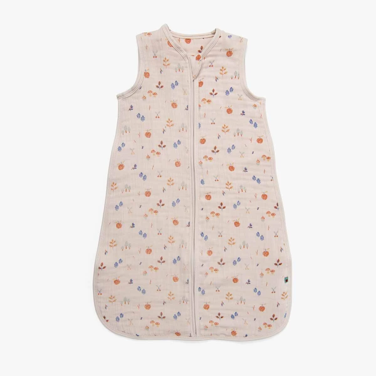 Gigoteuse 6-24 mois (TOG 1) en coton biologique pour laisser respirer la peau de bébé, avec imprimé cueillette. Fermeture à glissière et boutons-pression pour un habillage facile.