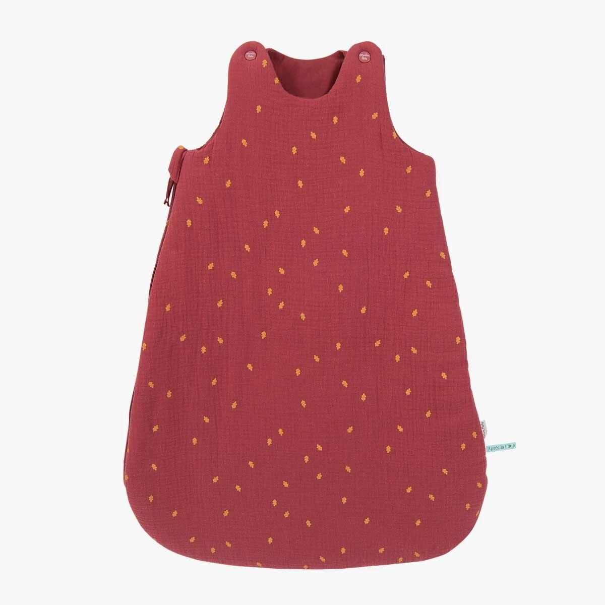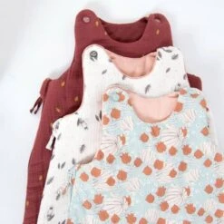 Gigoteuse 0-6 mois (TOG 3) en matières naturelles : lange terracotta avec motif feuilles de chêne sur l’extérieur, et doublure en toile 100% coton pour laisser respirer la peau de bébé. Fermeture à glissière et boutons-pression pour un habillage facile.