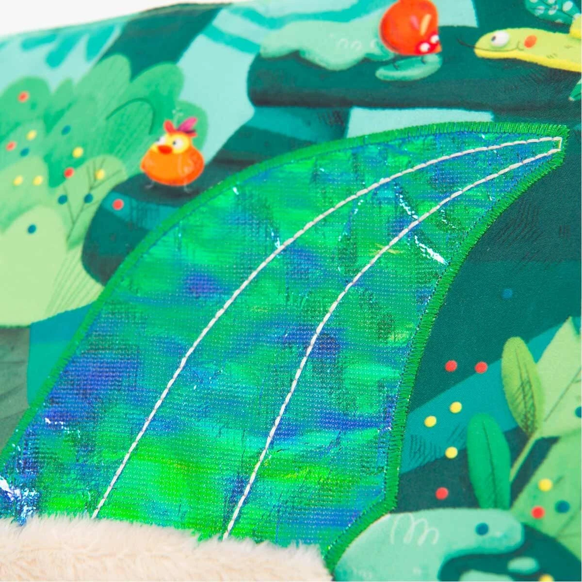 Livre en tissu 6 pages avec un petit poussin chantant à accompagner dans toutes les activités de la jungle ! Jeux de matières à découvrir et éléments à scratcher, il est idéal pour développer la motricité fine !