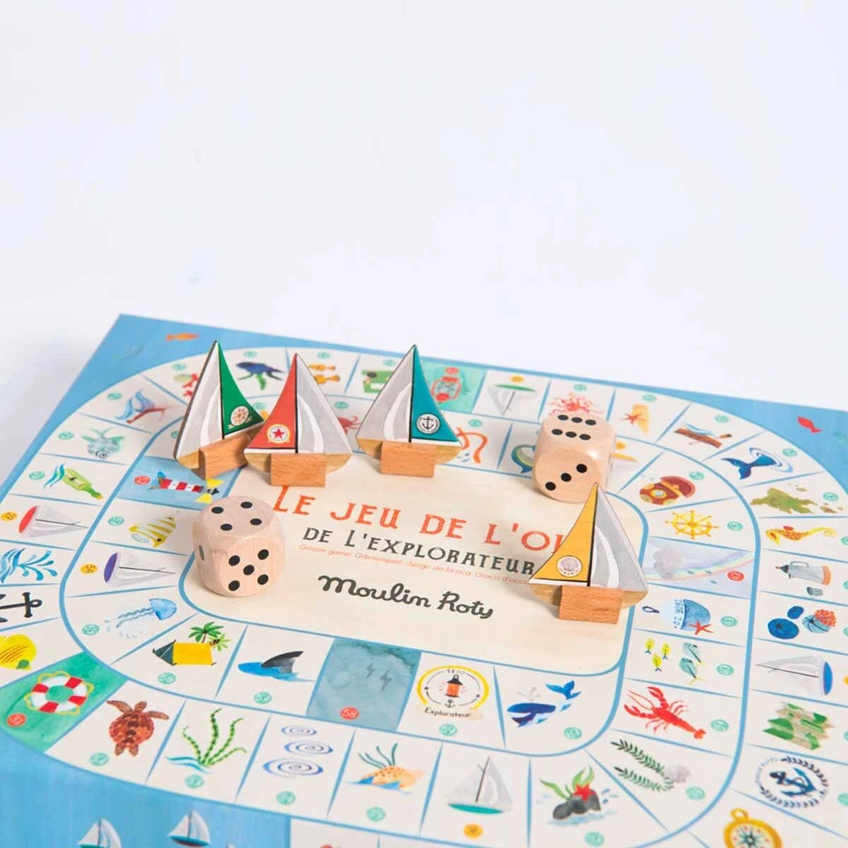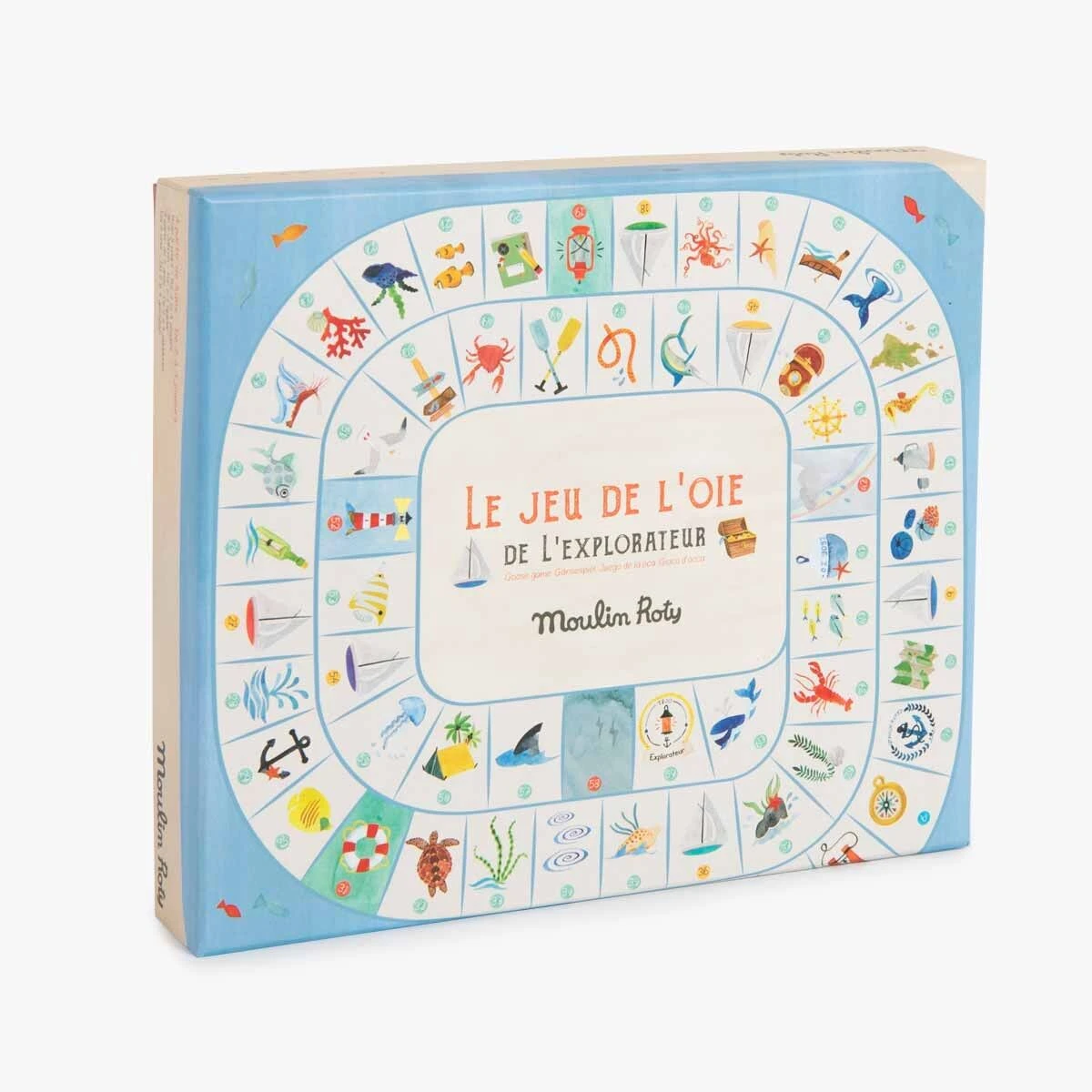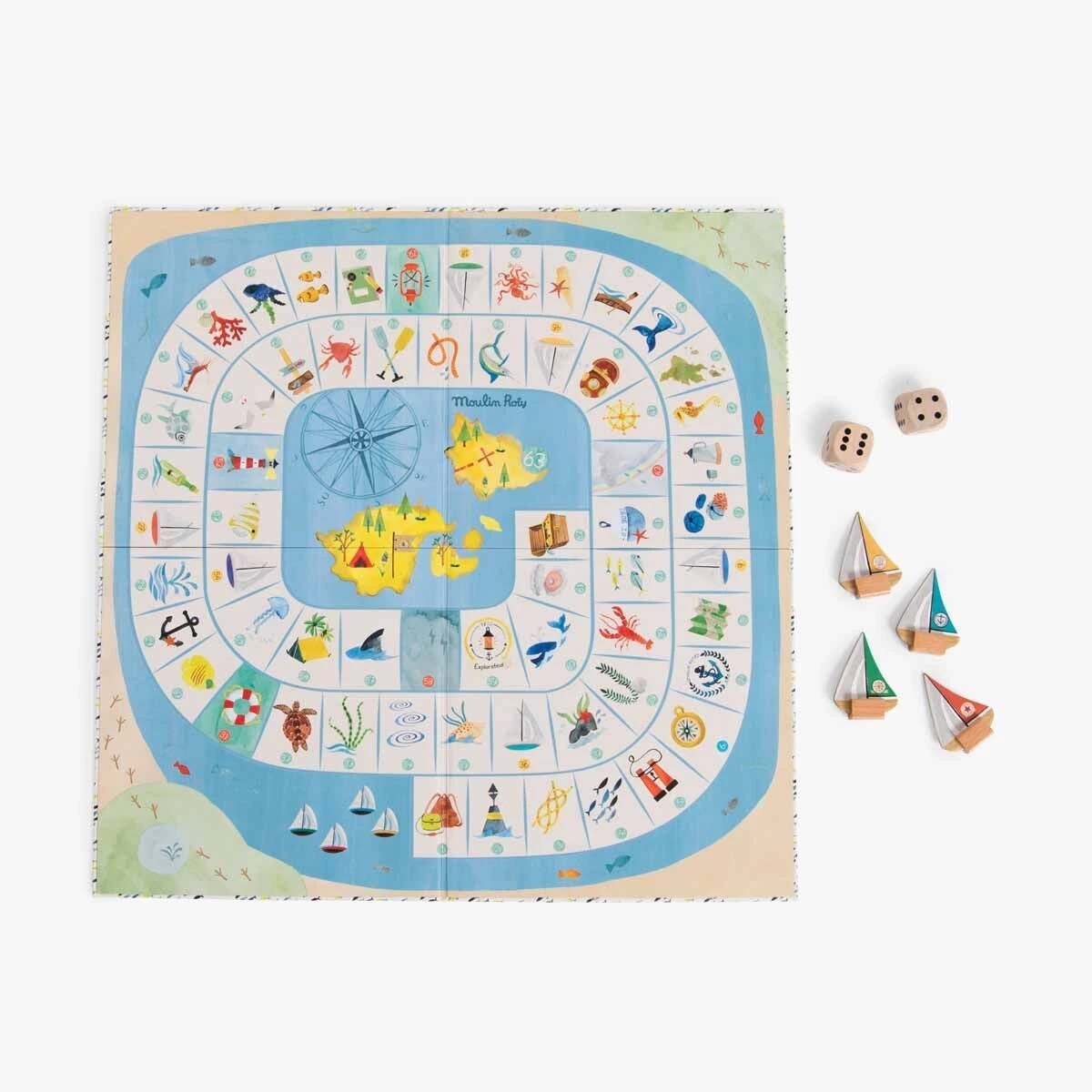 Un jeu de l’oie spĂ©cial explorateur oĂč l’on croise de drĂŽles de poissons et de dangereux tourbillons⊠Hissez les voiles, le premier arrivĂ© sur l’Ăźle gagne le trĂ©sor ! Comprend 4 pions bateaux, 2 grands dĂ©s et un plateau illustrĂ© Ă l’aquarelle.