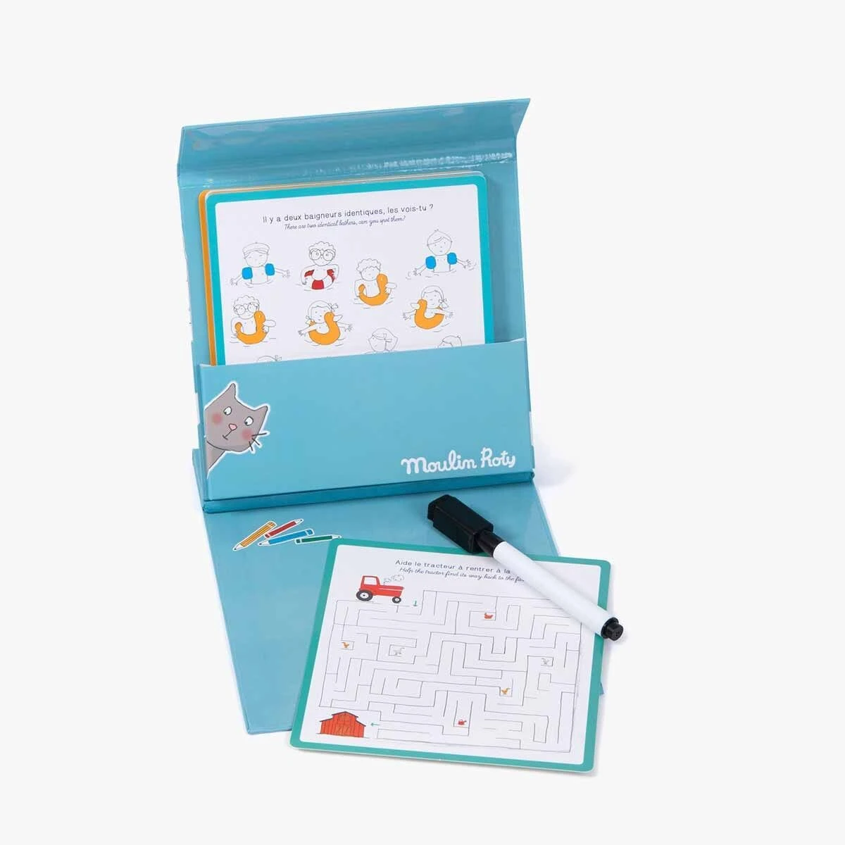 Jeux nomades à emporter partout avec soi ! La boîte comporte une planche de jeu, un crayon effaçable et 15 cartes de jeux d’observation et de logique, avec les solutions. Idéal pour occuper les enfants lors des longs trajets.