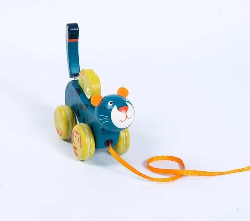 Panthère à tirer en bois, imprimée de motifs de la jungle. Elle repose sur 4 roues désaxées reproduisant le mouvement de ses foulées, et sa queue tenue par un ressort, se met à bouger ! L’enfant jouera aussi avec son ami caméléon tenu par un élastique.