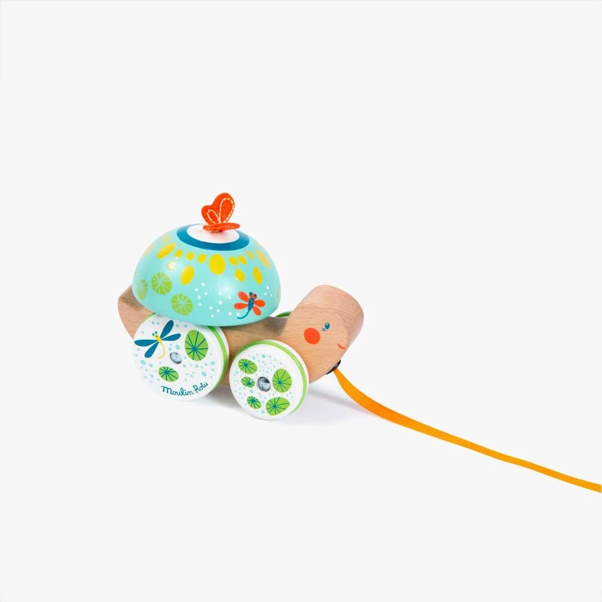 Tortue à tirer en bois coloré, imprimé de motifs et illustrations. Quand elle roule, sa carapace tourne sur elle-même ! Développe la motricité de l’enfant. Jouet à tirer par un ruban.