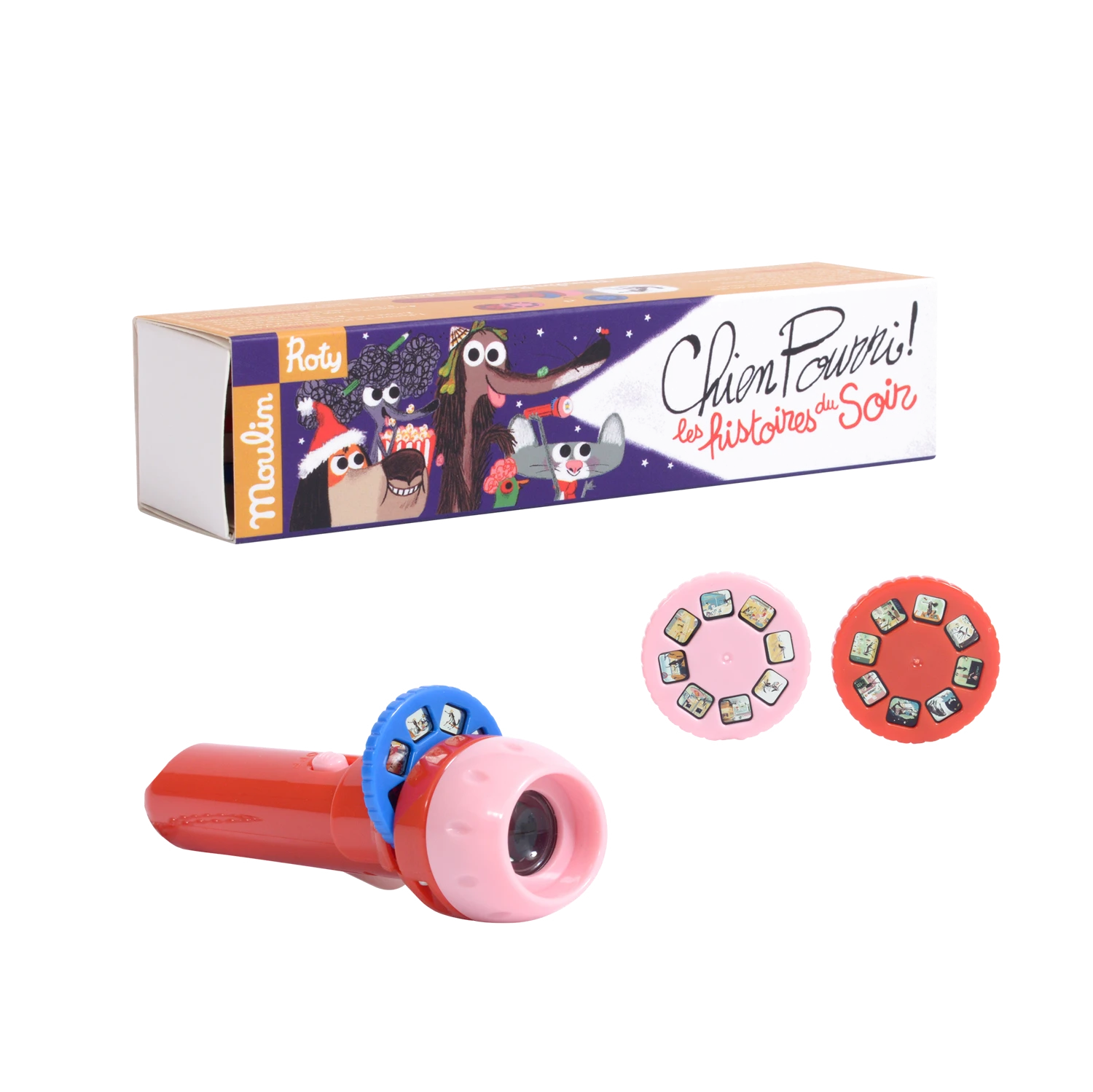 Lampe torche de poche où chacun des 3 disques projetés sur le mur raconte les aventures délirantes de Chien pourri, héros farceur de l’école des loisirs. Les illustrations colorées embarquent l’enfant dans un monde imaginaire où il y a tout à inventer !