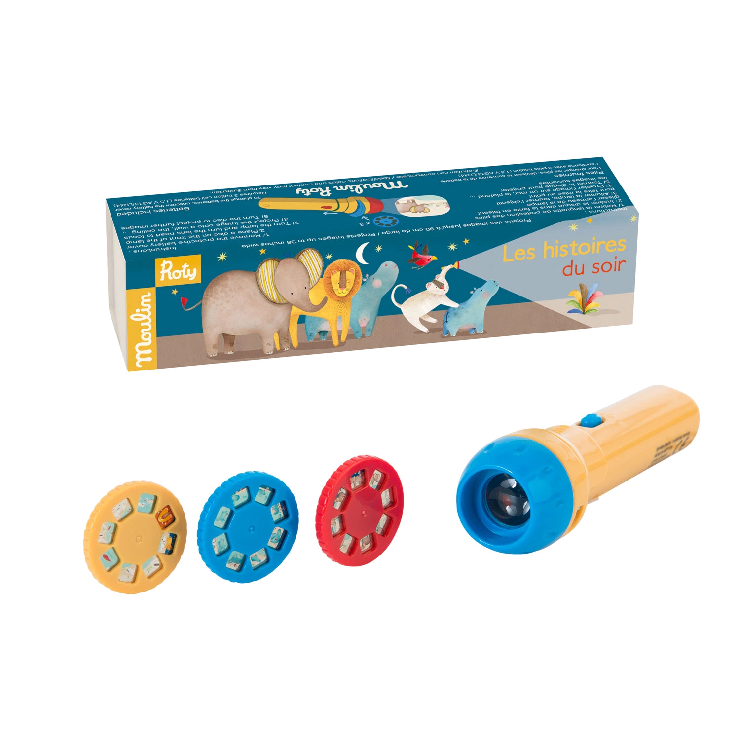 Pour endormir les tout-petits : Lampe torche de poche comprenant trois disques à emboîter. Chacun des disques, projeté sur le mur raconte une histoire en couleurs:- 1 : La douche des éléphants !- 2 : L’appel de la maman hippopotame !- 3 : La découverte des lionceaux !Illustrations aux couleurs douces, pleines de tendresse, représentant les personnages Papoum accompagnés chacun de leur tout – petit, réunis au beau milieu de la savane pour la baignade du soir.