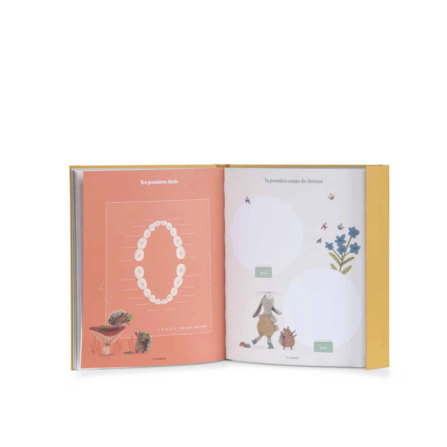 Ce livre à trésors de 80 pages illustrées, accompagne les enfants de ses premiers jours à ses 6 ans. Un recueil de mots et d’images, avec 6 enveloppes à souvenirs et 1 toise en cadeau. Fermeture aimantée, et textes non genrés pour l’enfant;