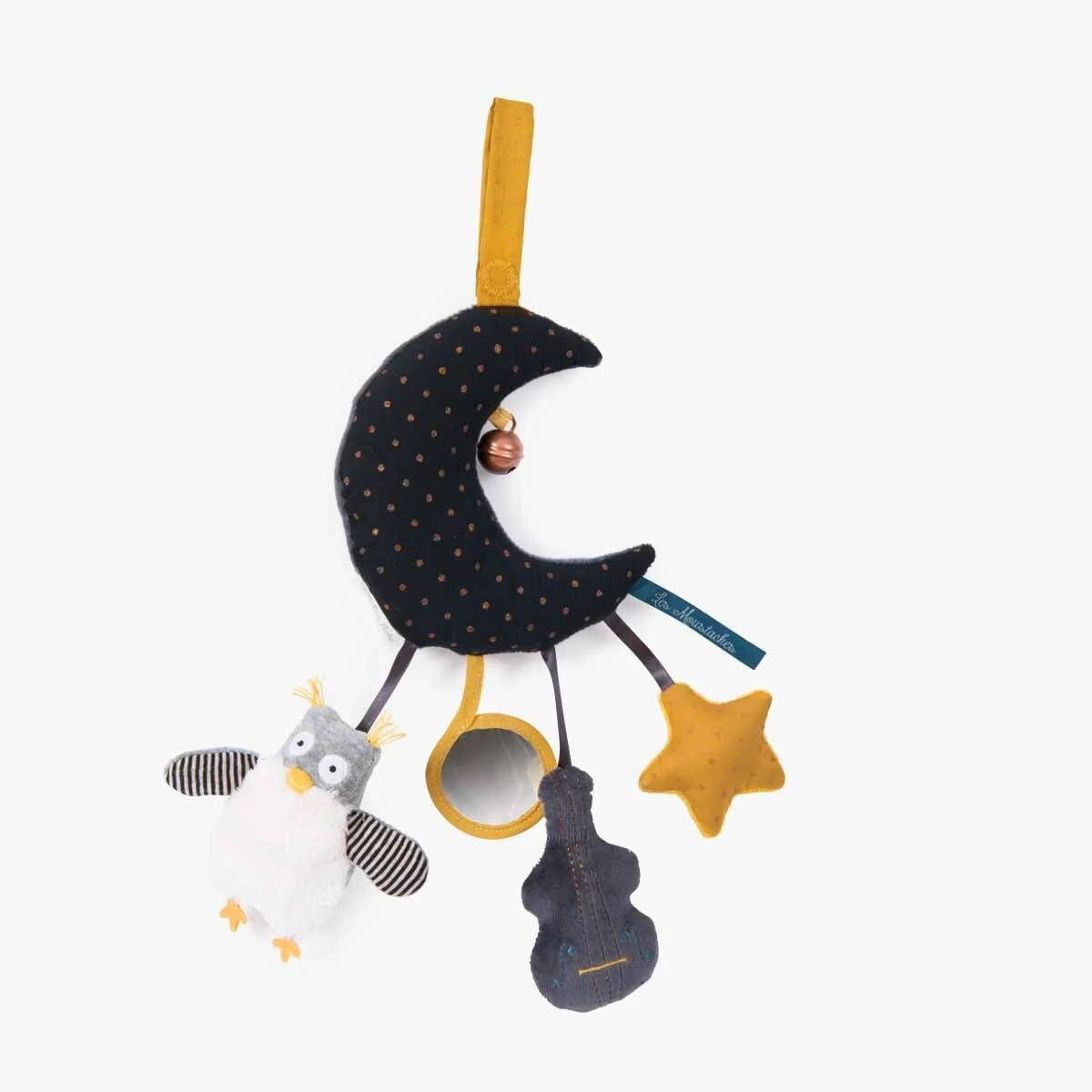 Pour jouer ou décorer, à suspendre partout, la lune d’activités en velours et coton comprend : un hibou tout doux avec papier crissant dans ses ailes, un miroir magique, une contrebasse qui fait diling !, une étoile pouët-pouët et un grelot brillant…