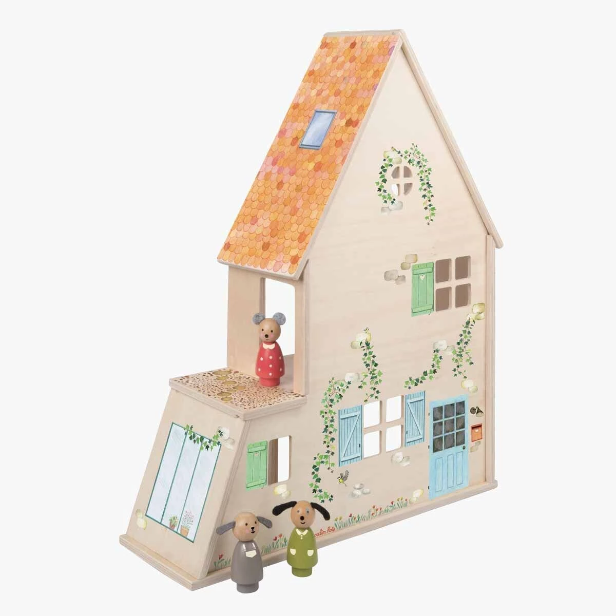Pour jouer et se raconter des histoires, maison de poupée en bois sérigraphiée, à monter, ambiance maison de village comprenant une cuisine, une chambre dortoir, une salle de bain, un jardin d’hiver, un grenier pour se cacher et tout son mobilier.