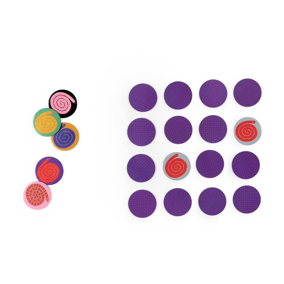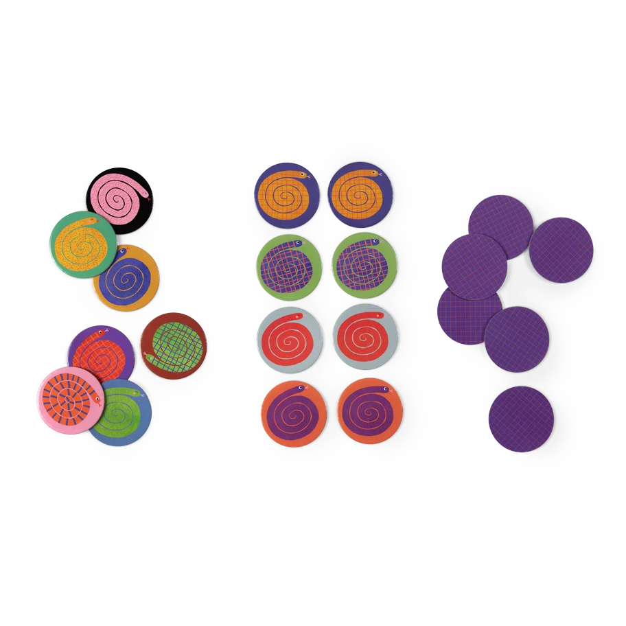 Jeu d’observation et mémoire des motifs et couleurs sur le thème des serpents ! Toutes les cartes rondes joliment illustrées, sont faces cachées sur la table, celui qui collecte le plus de paires de serpents est le gagnant. Contient 28 cartes. Dès 3 ans.