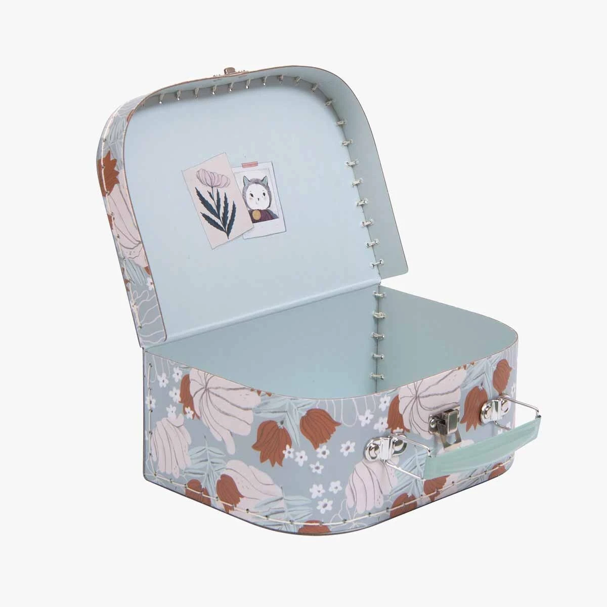 Valise dĂ©co en carton avec finition cousue, poignĂ©e et ouverture mĂ©tal. IllustrĂ©e de l’univers dĂ©licat d’AprĂšs la pluie, motif fleurs sur fond turquoise, elle permettra de ranger et transporter les personnages et trĂ©sors de la collection !