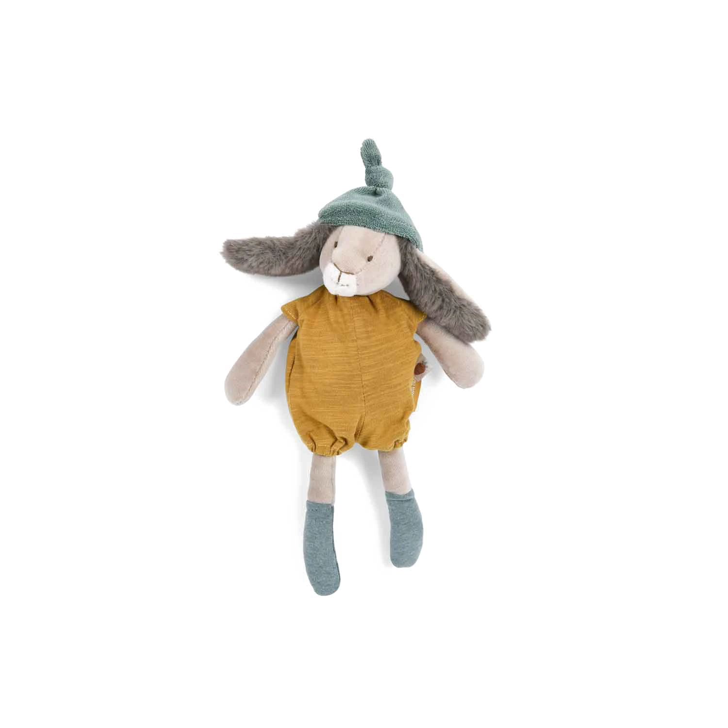 Petit lapin en velours éponge, vêtu de sa barboteuse ocre en jersey flammé. Avec son pompon au bout du bonnet, ses grandes oreilles toutes douces et ses longues pattes, ce compagnon apaisant et rassurant est facile attraper;