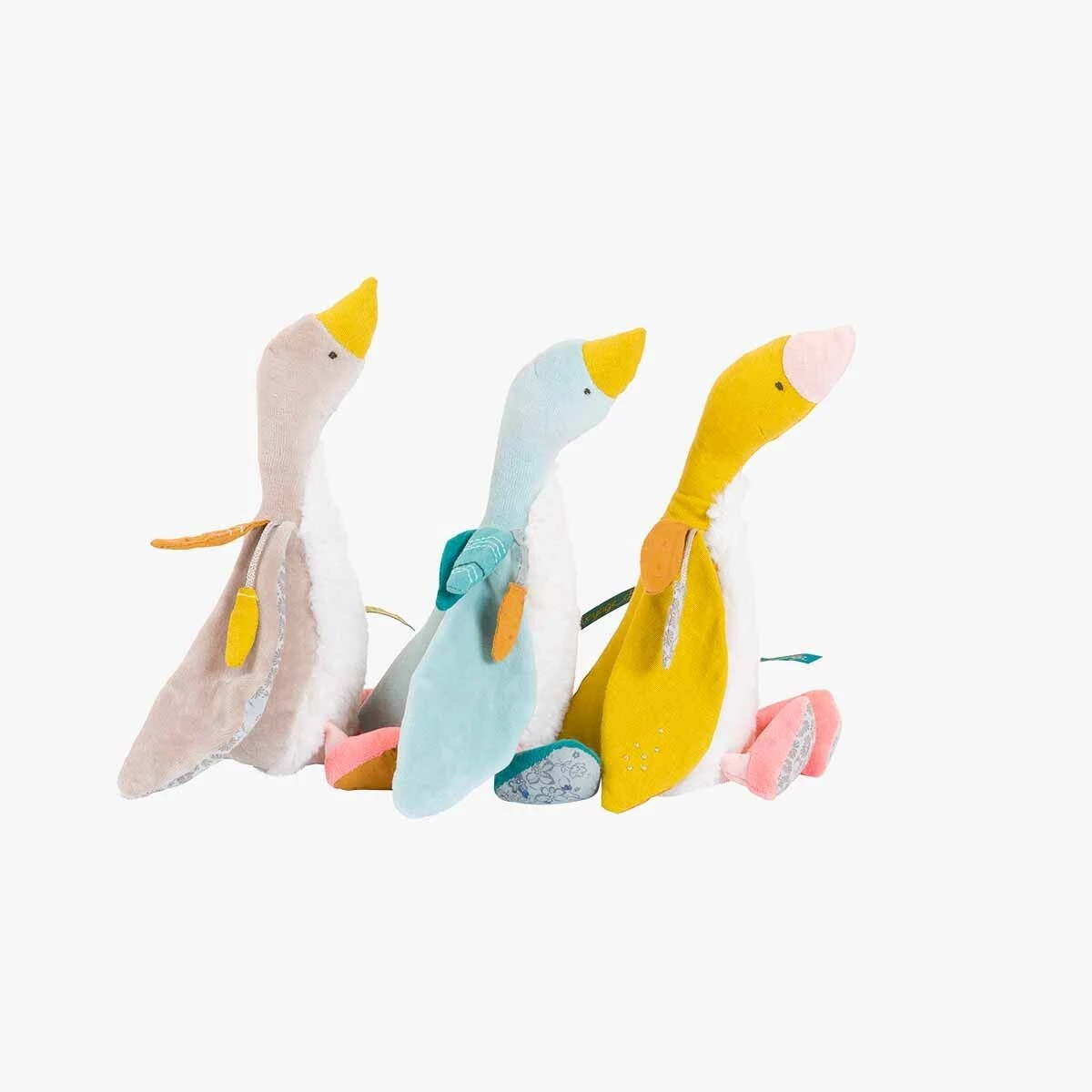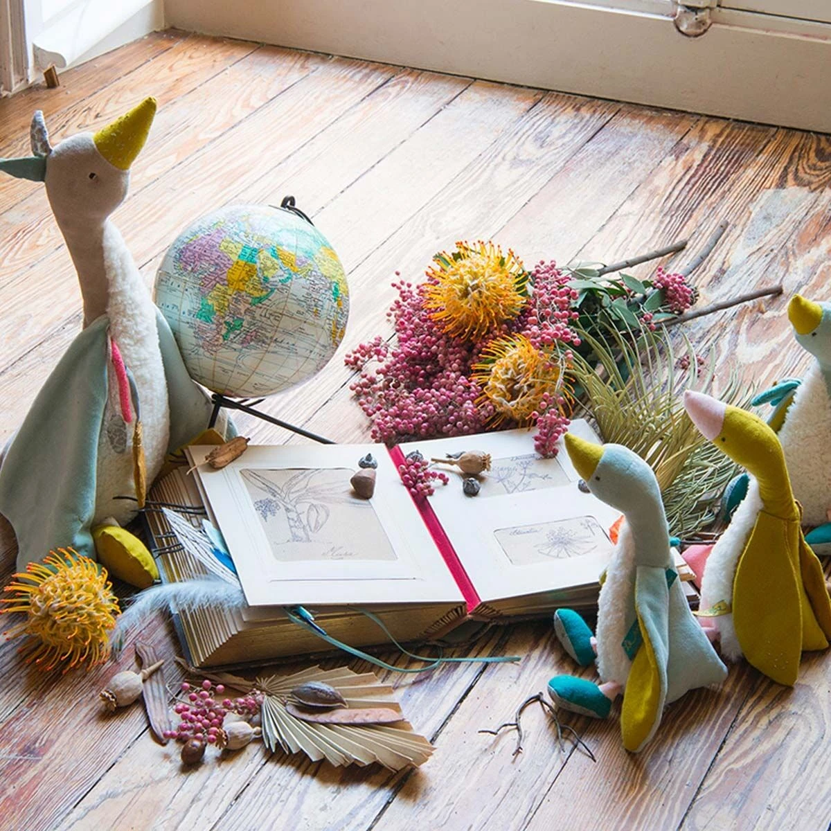 Invitation au voyageâŠPoupĂ©e petite oie sauvage Plumette, au doux plumage crĂšme et bleu grisĂ©, avec des petites ailes en velours et lin. Elle porte Ă son cou, des plumes, comme des gris-gris porte-bonheur Ă offrir sur son passageâŠ