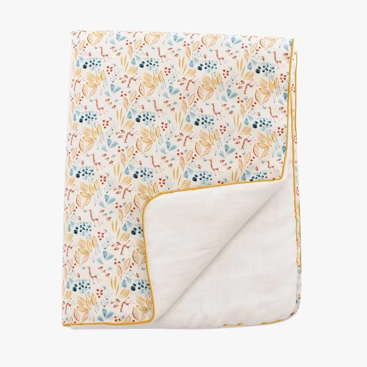 Edredon en lin lavé beige avec imprimé girafes, feuilles et motifs colorés, et passepoil en coton orange. Cette couverture moelleuse est idéale pour recouvrir bébé de douceur, le tenir au chaud et décorer sa chambre.