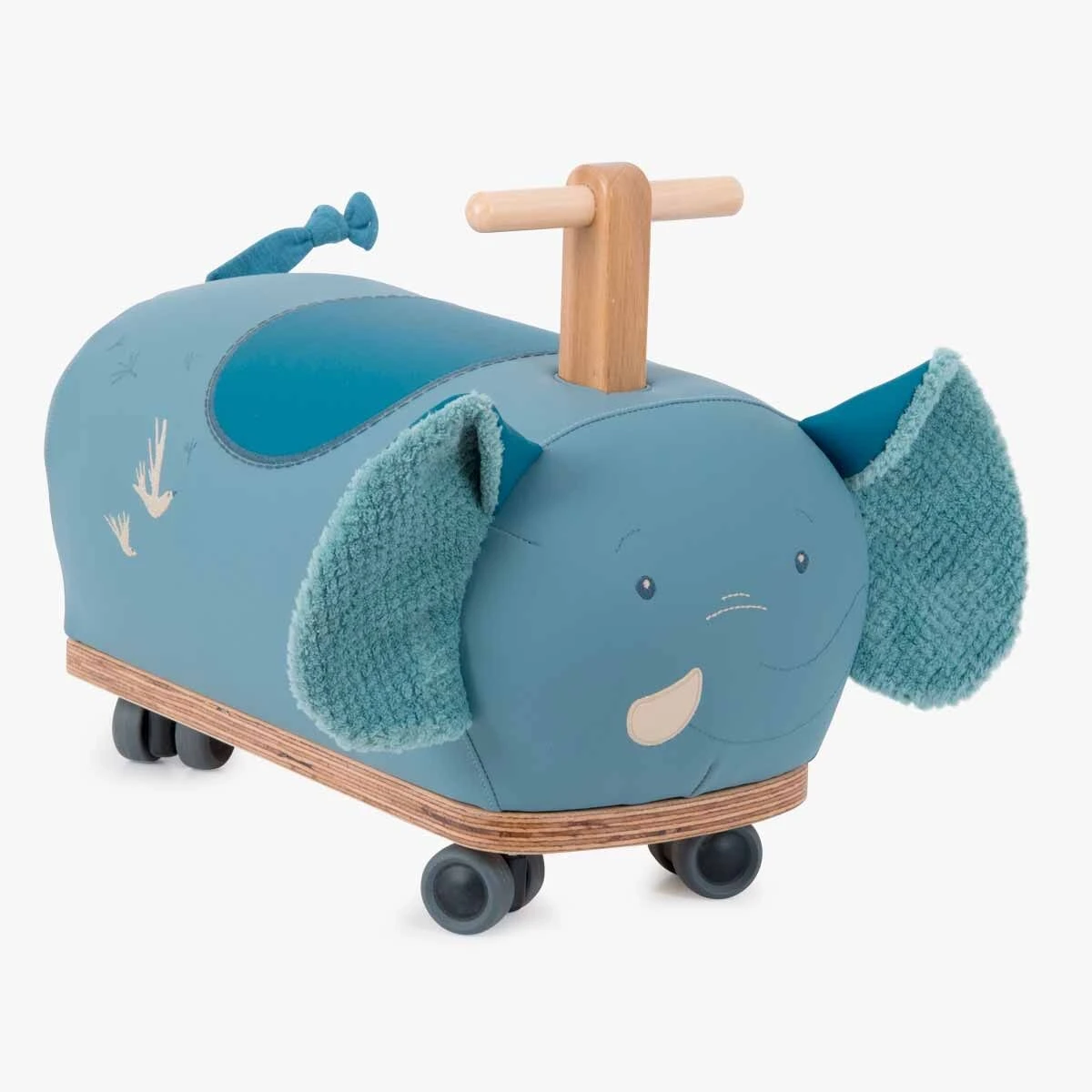 Porteur éléphant à 4 roues folles, pour les tout-petits, en bois et simili cuir bleu. Sa trompe est brodée et l’intérieur de ses oreilles sont en fourrure toute douce. Il est conçu pour les enfants de moins de 25 kg.