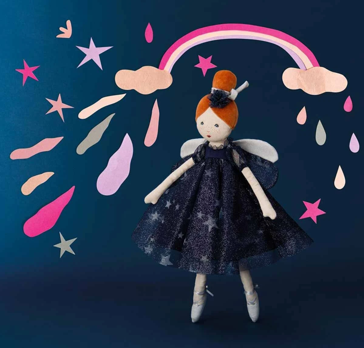Poupée danseuse étoile, la fée Céleste au délicat visage brodé et sérigraphié est vêtue pour le grand spectacle. Sa robe bleu nuit est ornée de tulle pailleté avec étoiles et petites ailes de fée, et ses chaussons de danse lacés d’un ruban de satin.