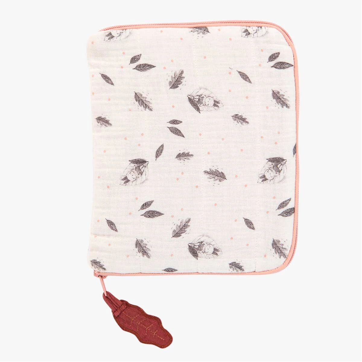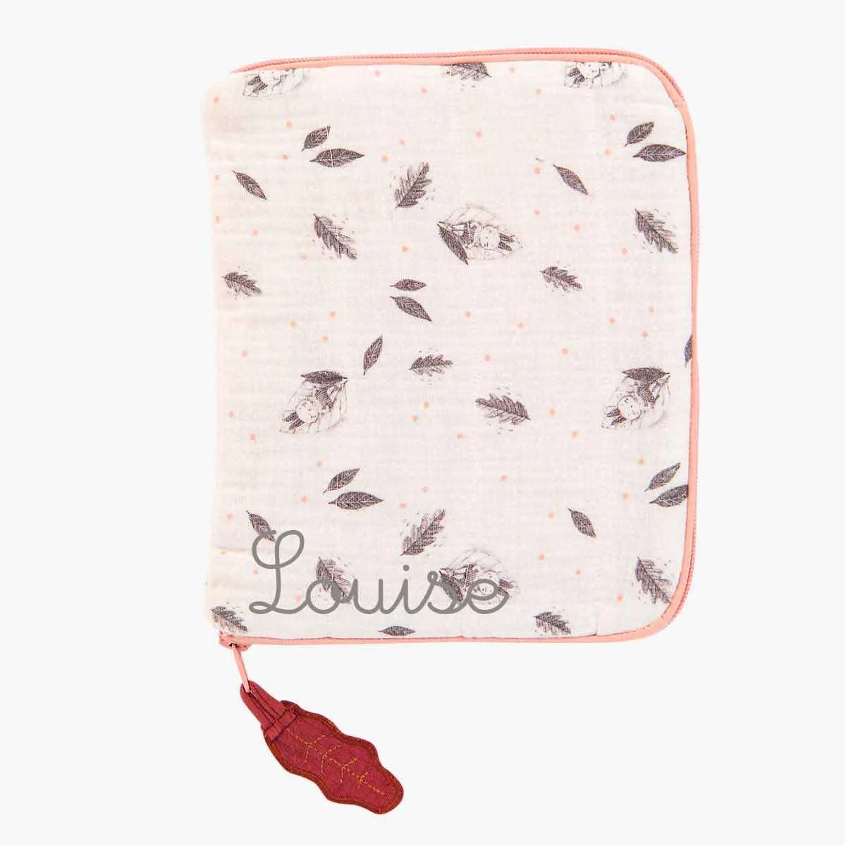 Pochette de protection pour carnet de santé, zippée, en lange crème avec un tendre motif de lapin endormi dans sa feuille… Elle peut être brodée au prénom de l’enfant, idéal pour un cadeau naissance.