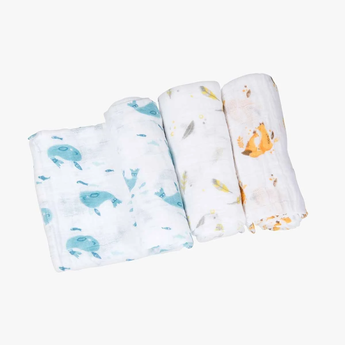 Set de 3 langes gris imprimés d’illustrations poétiques et raffinées de la gamme. Tissu souple et léger, 100% coton, qui protége aussi bien du chaud comme du froid. Le lange « plumes » peut être brodé au prénom de l’enfant. Idéal pour un cadeau naissance.