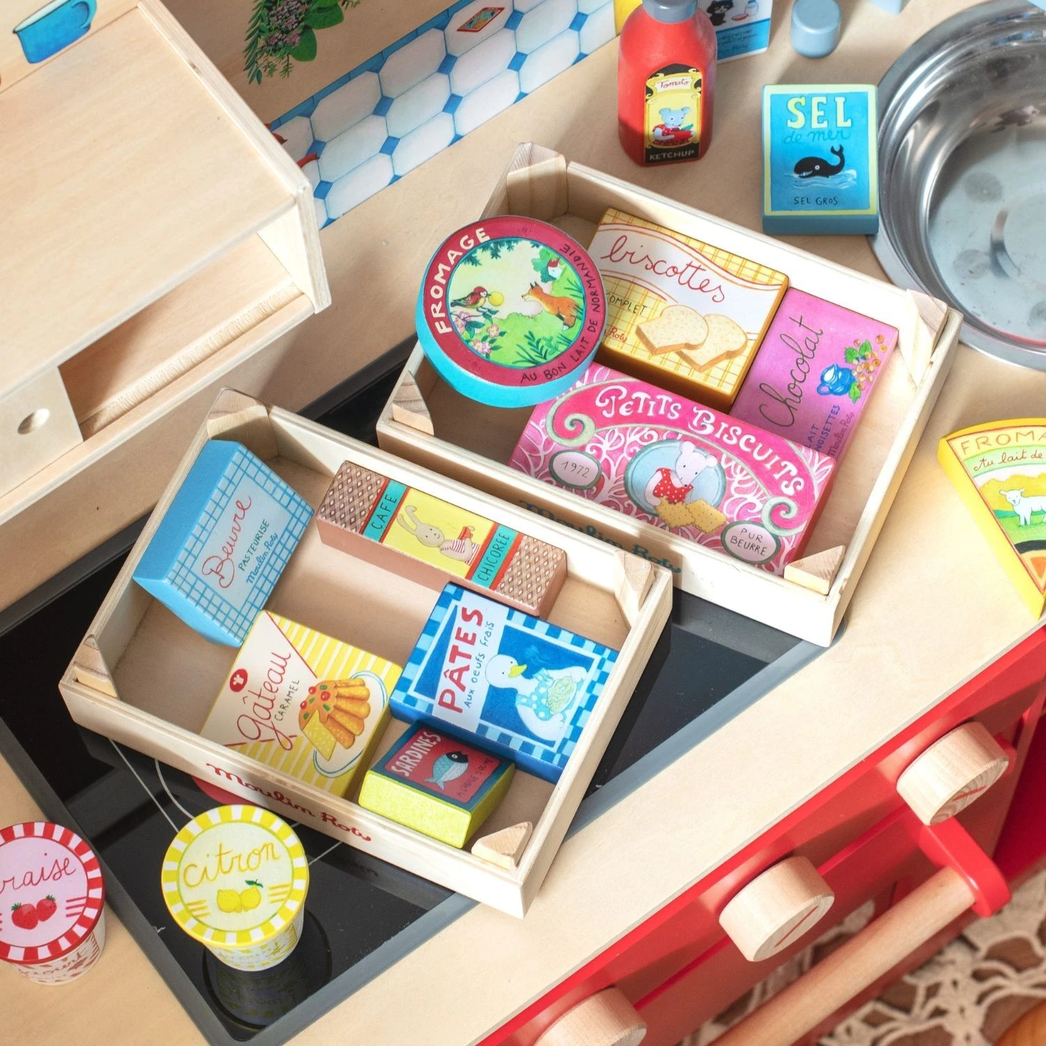 Le set est composé d’une jolie caissette garnie d’une sélection de produits d’épicerie. Chocolat, petits biscuits, sardines en conserve… comme pour de vrai ! Tout en bois, ces pièces de jeu peuvent s’associer à la cuisinière de la même collection.