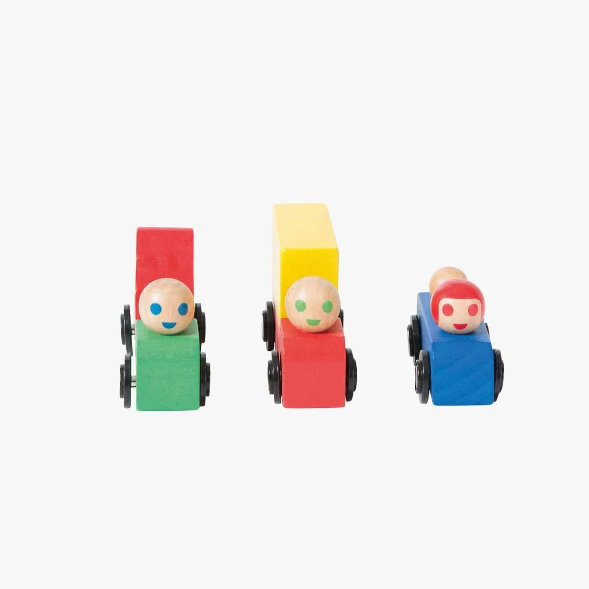 Assortiment de 3 camions en bois aux couleurs denses, primaires, aux lignes graphiques et épurées avec à leur bord, des bonhommes tout ronds.Création d’Aurélien Débat qui permet à l’enfant de développer la manipulation, les notions d’espace et de couleurs.